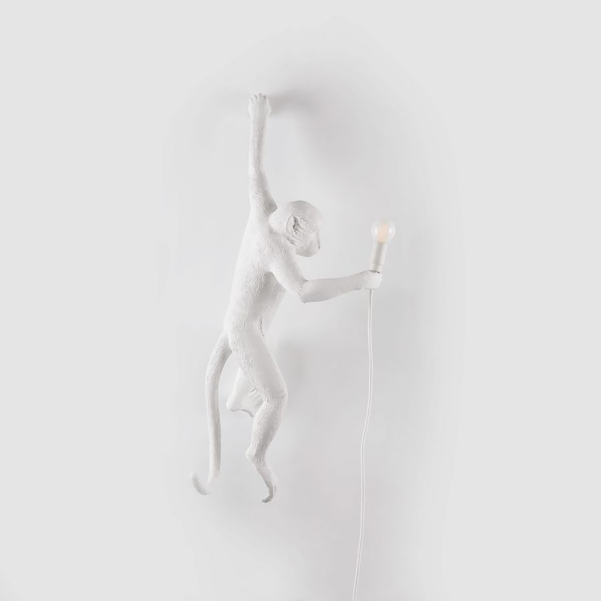 Monkey Lamp Hanging Left Hand White Seletti by Marcantonio è la lampada da parete realizzata in resina ed ispirata ad una simpatica scimmietta tuttofare che tiene nella zampa una lampadina LED collegata alla presa elettrica e destinata ad esclusivo utilizzo indoor.