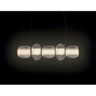 Artemide Alambicco Orizzontale Lampada da soffitto è la lampada da soffitto dove un corpo illuminante modulare esalta la bellezza del vetro soffiato, giocando con trasparenze e texture per modulare e diffondere la luce. Al centro si trova una struttura in alluminio estruso che ospita i circuiti LED su quattro facce opposte: è il cuore tecnologico attorno a cui si sviluppano i vari strati. Il primo strato è un cilindro in vetro zigrinato, pensato per rifrangere la vista degli elementi tecnologici senza nasconderli del tutto, garantendo un’emissione luminosa priva di abbagliamento. Su questo si sovrappongono diffusori dalle forme morbide e trasparenti, arricchiti da una lavorazione artigianale che si ispira all’antica tecnica del balloton.