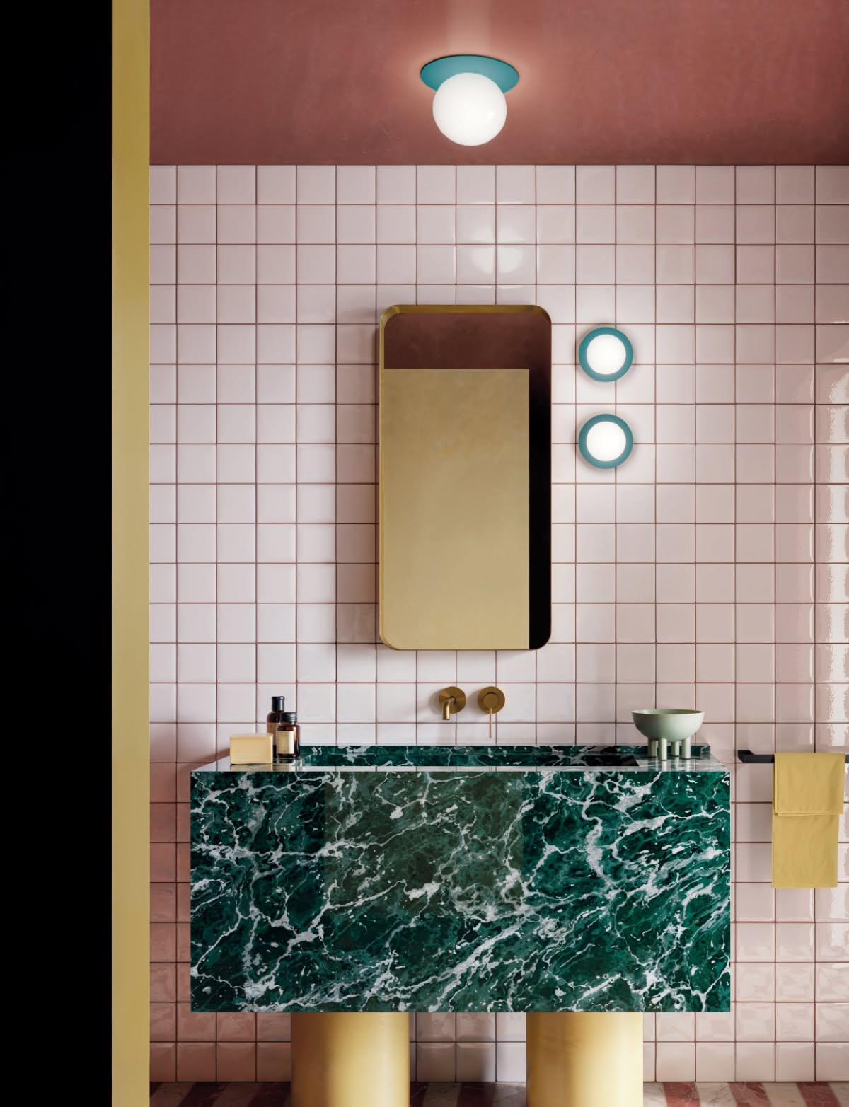 Kiss Lampada da parete-soffitto è la applique-plafoniera di design in metallo e vetro dove pochi elementi si combinano, con apparente semplicità, in oggetti raffinati, nei quali la cura del dettaglio è determinante. Sfere di vetro soffiato diventano pura luce, adagiate con morbidezza su dischi in metallo colorato che fluttuano nello spazio, mentre dentro di esse la più alta qualità tecnologica svolge il proprio compito.