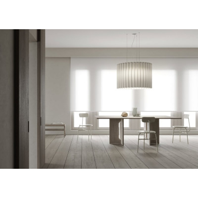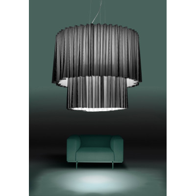 Skirt Doppia Lampada da soffitto è la lampada da soffitto che prende ispirazione dal mondo della moda, in particolare dall’omonimo indumento. La sinuosità e leggerezza delle sue forme rendono Skirt una lampada raffinata ed elegante. Le variazioni dimensionali e le molteplici tonalità, unite all’unicità del suo design, garantiscono a Skirt flessibilità di utilizzo. Una collezione che ben si adatta infatti a stili ed ambienti diversi. Il tessuto di questa lampada ha inoltre proprietà fonoassorbenti che permettono di ridurre i rumori fino al 53%, grazie alla sua Area Equivalente di Assorbimento che arriva ad un massimo di 3.55.