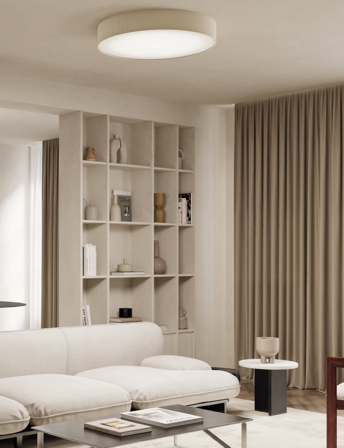 Tessy Pongè Lampada da soffitto è la lampada da soffitto dove un disco avvolto nel tessuto combina l’eleganza della tradizione aziendale con la più recente tecnologia luminosa. Nasce una collezione nella quale la forma lascia spazio al dettaglio, e la luce diventa protagonista.