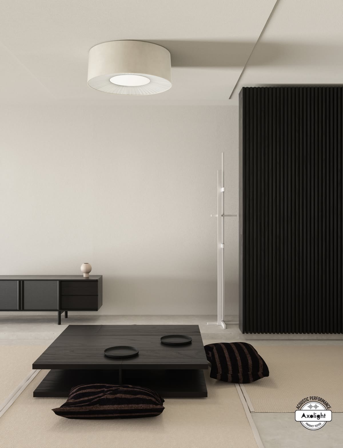 Velvet Lampada da soffitto è la plafoniera da soffitto che mantiene intatta la sua eleganza e raffinatezza. La semplicità della sua geometria viene arricchita da un tessuto sofisticato. La multidimensionalità e la molteplicità di colori rendono Velvet una lampada versatile, adattandosi ad ambiti diversi, da quello domestico al mondo dell’hospitality e contract. Al comfort visivo che Velvet assicura, si unisce anche quello acustico, grazie al suo tessuto che la rende una soluzione fonoassorbente. La sua Area Equivalente di Assorbimento, che raggiunge un massimo di 2.05, può ridurre infatti i rumori fino anche del 40%.