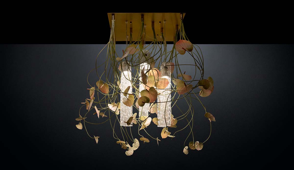 Lampadario Anthurium Flowers Power H 80 105X60 by VGnewtrend è un lampadario da soffitto composto da fiori artificiali VG e cilindri in vetro muranese, illuminati a LED, con piastra sospesa o da incassare a soffitto. Le dimensioni della piastra sono inferiori rispetto alle dimensioni di ingombro di 15 cm in larghezza e profondità.