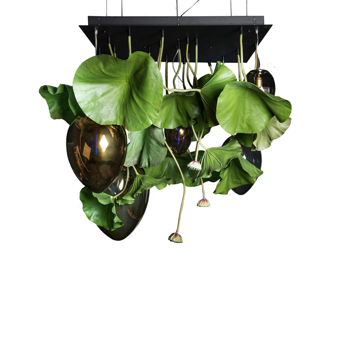 Lampadario Lotus Glass Eggs H 100 150x150 by VGnewtrend è un lampadario da soffitto composto da fiori artificiali VG e Crystal Eggs, illuminate con lampadine con attacco E27, con piastra sospesa o da incassare a soffitto. Le dimensioni della piastra sono inferiori rispetto alle dimensioni di ingombro di 15 cm in larghezza e profondità.