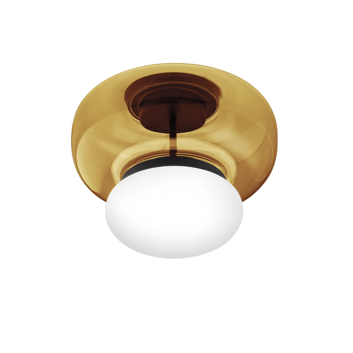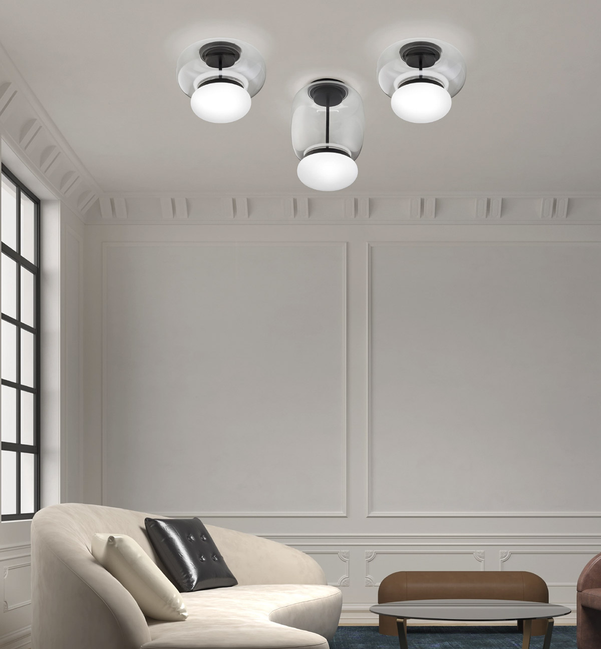 Faro PL lampada da soffitto di Vistosi è la lampada da soffitto anello di congiunzione tra il mare e la terra ferma; la sua luce è un punto di riferimento, che trasmette stabilità e sicurezza. La collezione Faro, disegnata per Vistosi da Oriano Favaretto, si ispira proprio all’impianto di segnalazione luminosa da cui prende il nome. I due vetri, uno con finitura trasparente colorata, l’altro bianco lucido, rievocano rispettivamente le acque limpide della laguna veneziana e la terra ferma. L’anello metallico che li congiunge in maniera armonica, invece, è il faro: elemento centrale e sicuro. La montatura metallica è disponibile in finitura nero opaco o ottone. Nel vetro bianco è nascosta la sorgente luminosa LED, che regala una luce diffusa, uniforme e non abbagliante, proprio come un faro per i marinai o i pescatori che lo guardano dal mare. Faro è un elemento di design che diventa protagonista dello spazio in cui è installato, visibile e perfettamente riconoscibile da qualunque posizione.