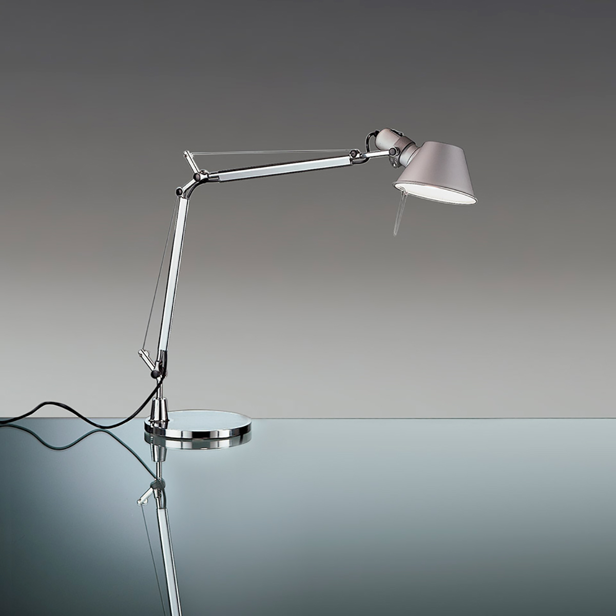 Artemide Tolomeo Mini LED Alluminio lampada da tavolo è la lampada da tavolo disegnata da Michele De Lucchi e Giancarlo Fassina, adatta a qualsiasi ambiente e contesto, diventata ormai un oggetto conosciuto e apprezzato ovunque in virtù del suo design unico della grandissima versatilità di utilizzo. È caratterizzata da base e struttura a bracci mobili in alluminio lucidato, diffusore in alluminio anodizzato e da snodi e supporti in alluminio brillantato. Sistema di equilibratura a molle.