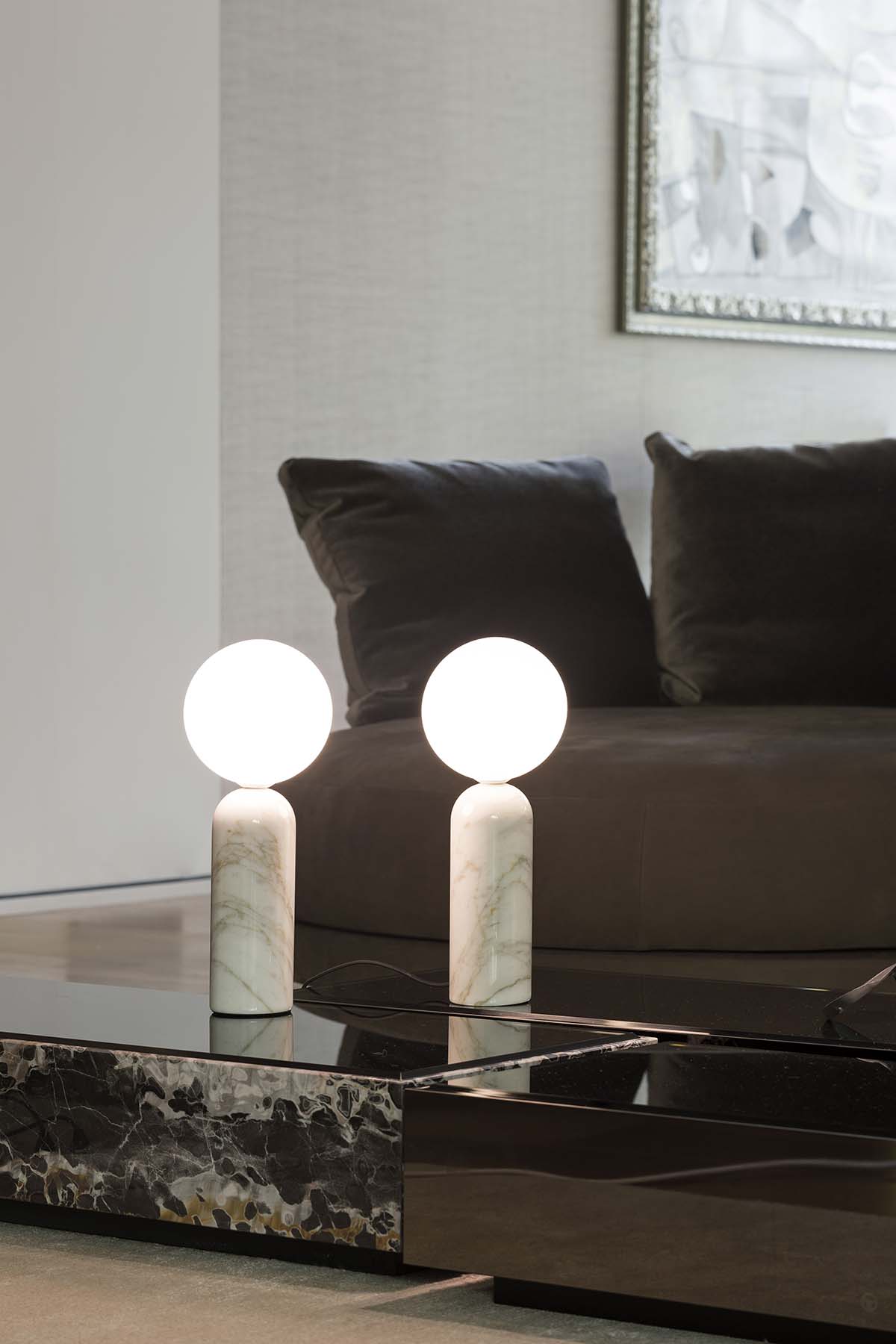 Emma lampada da tavolo di Contardi è la lampada da tavolo dove l'uso del prezioso marmo, un elemento chiave della collezione, rende Emma un oggetto di vero design che aggiunge luce a qualsiasi superficie. La base nella versione da tavolo, a parete e a plafone, sono realizzati in marmo verde Guatemala o bianco Calacatta; il diffusore è un'affascinante sfera opale bianca che, grazie alla sua pura essenza, diffonde la luce in modo uniforme. Il fascino semplice e le forme sinuose di Emma si adattano a diversi tipi di ambienti, siano essi residenziali, retail o hospitality.