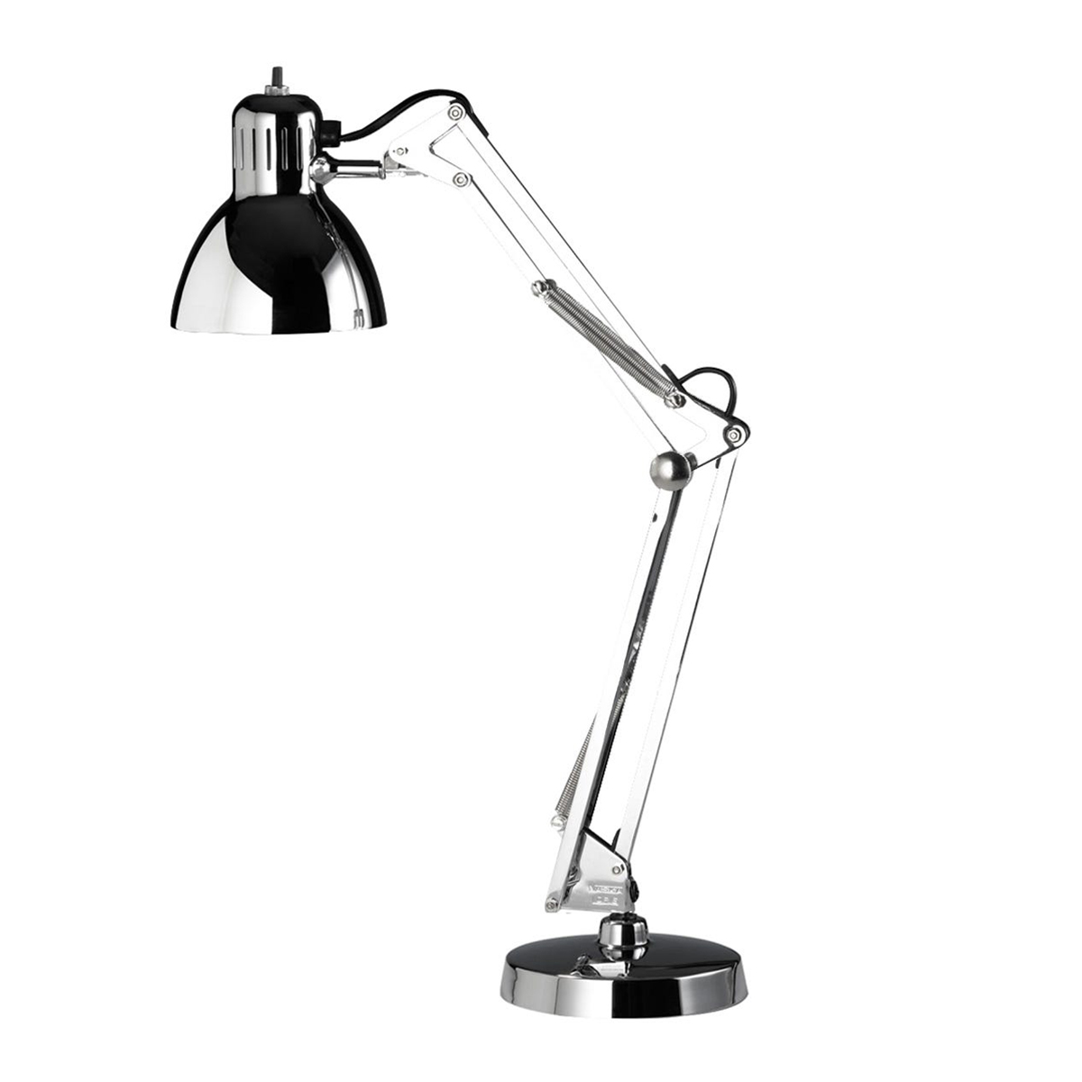 Lampada da tavolo a luce diretta non dimmerabile. Base e corpo orientabile in metallo galvanizzato cromato. Accensione tramite interruttore a rotazione posto sulla testa del diffusore. Cavo e spina neri. Spina europea due poli. Fonte luminosa non inclusa.