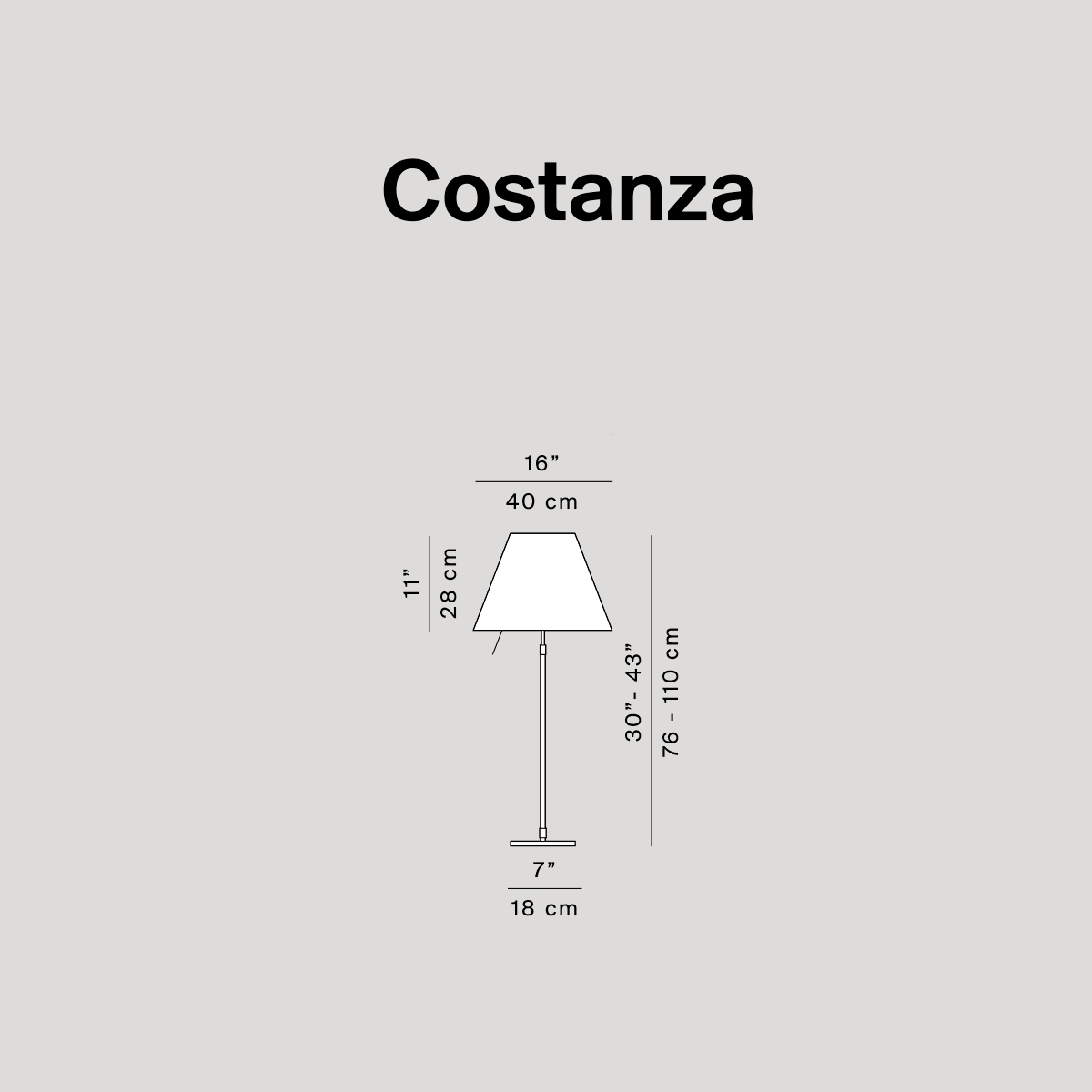 Luceplan Costanza D13i Lampada da tavolo è la lampada da tavolo con stelo telescopico tanto discreta quanto solida. Costanza si inserisce con semplicità in ogni ambiente senza porre vincoli stilistici di accostamento. Il paralume di policarbonato appoggia su uno stelo di alluminio che, in virtù dell'innovativa tecnologia telescopica, può essere facilmente regolato in altezza da 76 a 110 cm. L'interruttore a forma di asta si trova direttamente sull'attacco del portalampada, che può accendere e spegnere comodamente la luce della lampada. Costanza si inserisce magnificamente in qualunque ambiente, dalla camera da letto alla zona giorno o ufficio come lampada da lettura. Anche in virtù della forma del paralume che permette la diffusione della sua luce sia verso il basso sia leggermente verso l'alto, può essere utilizzata con successo anche per l'illuminazione d'atmosfera.