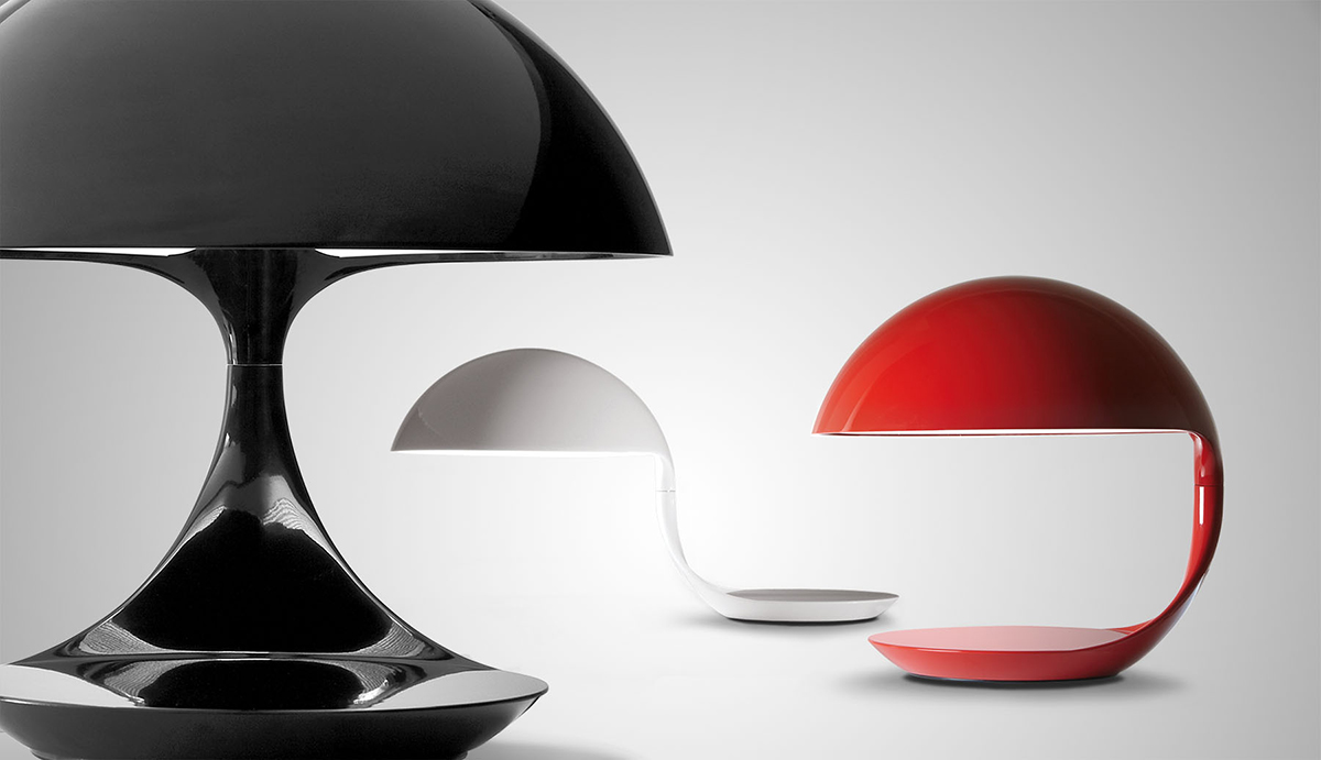 Disegnata nel 1968 da Elio Martinelli, il Cobra rappresenta uno dei primi apparecchi illuminanti in resina prodotti con un particolare sistema di stampaggio. La lampada è caratterizzata da una linea semplice e da una forma geometrica inscritta in una sfera, ma con la rotazione del braccio il riflettore assume una posizione che richiama la testa di un cobra pronto allo scatto. Lampada da tavolo a luce diretta, formata da due corpi stampati in resina. Disponibili nel colore bianco, nero o rosso. Il corpo inferiore ruota sulla base sottostante in acciaio ed è collegato al corpo superiore tramite un giunto centrale che permette la rotazione di 360°. Riflettore interno in alluminio verniciato nel colore bianco. Disponibile anche nelle diverse versioni del progetto Cobra Texture.