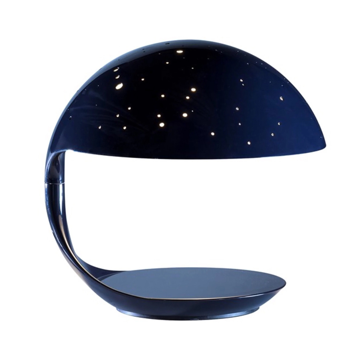 I 50 anni di una lampada così importante per la Martinelli Luce come il Cobra disegnato dal suo fondatore Elio Martinelli rappresentano certamente un evento importante per l’azienda. In questa occasione viene proposta una speciale versione del Cobra, un'interpretazione di Emiliana Martinelli come omaggio a suo padre. La lampada, prodotta solo in un esclusivo colore blu notte, è caratterizzata da serie di fori sulla calotta, a rappresentare la costellazione dello Scorpione, il segno zodiacale di Elio. Il corpo inferiore ruota sulla base sottostante in acciaio ed è collegato al corpo superiore tramite un giunto centrale che permette la rotazione di 360°. Riflettore interno in alluminio verniciato nel colore bianco. Disegnata nel 1968 da Elio Martinelli, il Cobra rappresenta uno dei primi apparecchi illuminanti in resina prodotti con un particolare sistema di stampaggio. La lampada è caratterizzata da una linea semplice e da una forma geometrica inscritta in una sfera, ma con la rotazione del braccio il riflettore assume una posizione che richiama la testa di un cobra pronto allo scatto.