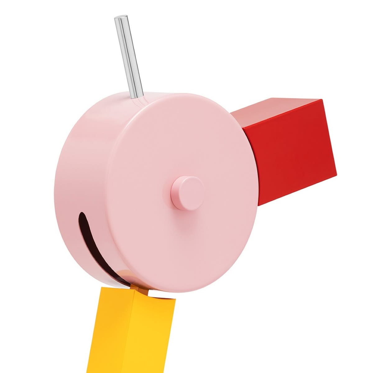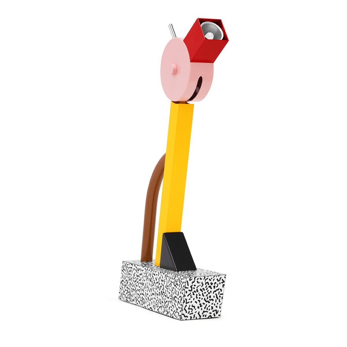 Memphis Milano Tahiti Lampada da tavolo di Ettore Sottsass è una lampada di design in metallo verniciato e laminato decorativo. Punto luce orientabile. Tahiti, capolavoro di Ettore Sottsass, è un’ironica lampada dalla forma zoomorfa che rimanda ai giochi dell’infanzia: nella testa si nasconde una lampada, ideale per illuminare un tavolo. La base con motivi del pattern Bacterio sostiene uno stelo giallo, evidenziato da un piede nero sul quale appoggia la “testa” rotonda rosa che ruota per dirigere la luce del becco rosso nella direzione desiderata.