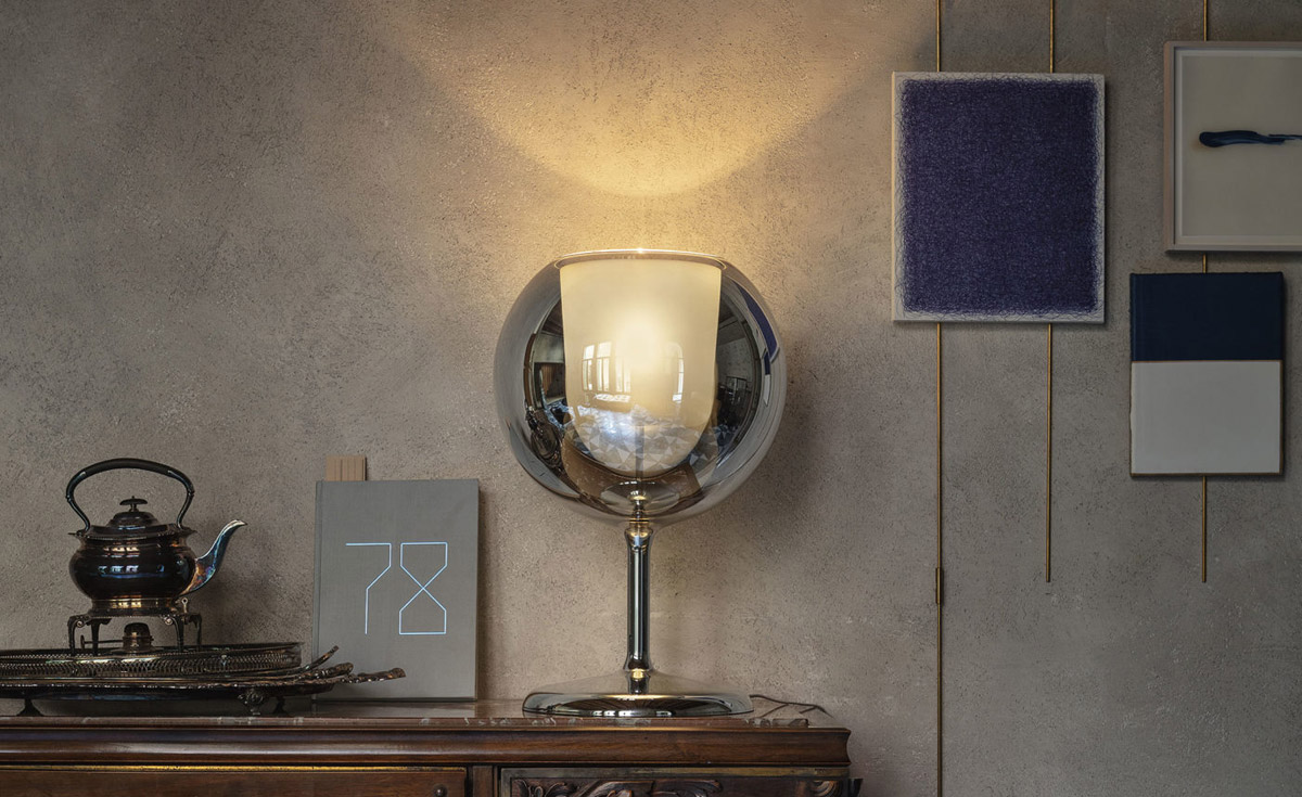 Glo Large Table lampada da tavolo è una lampada da tavolo icona della collezione, una sfera di vetro che esalta il riverbero della luce, in un gioco di riflessioni e rimandi tra la lampada e lo spazio o fra le lampade tra loro. La ricca palette e le diverse misure della variante sospesa sono un invito alla composizione. Lampade con struttura in metallo cromato lucido e vetro borosilicato. Diffusore esterno: trasparente, oro, argento, oro rosa, nero, 4ever, verde. Diffusore interno sabbiato. UL Certification disponibile solo per Glo large.
