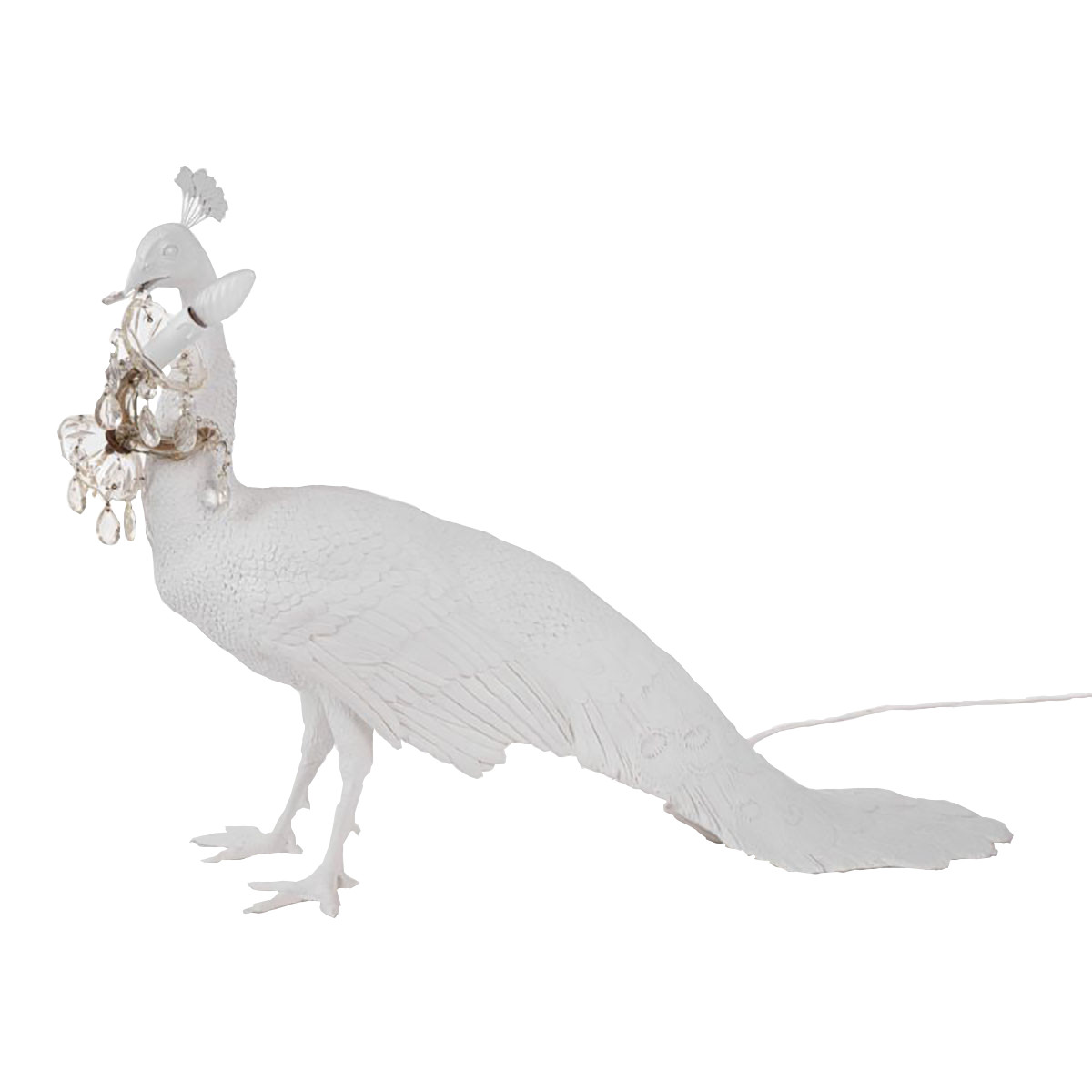 Peacock Lamp Seletti è la lampada da tavolo o da terra a LED realizzata in bellissima resina bianca ed ispirata ad un elegante e raffinato pavone che tiene nel becco il punto luce.