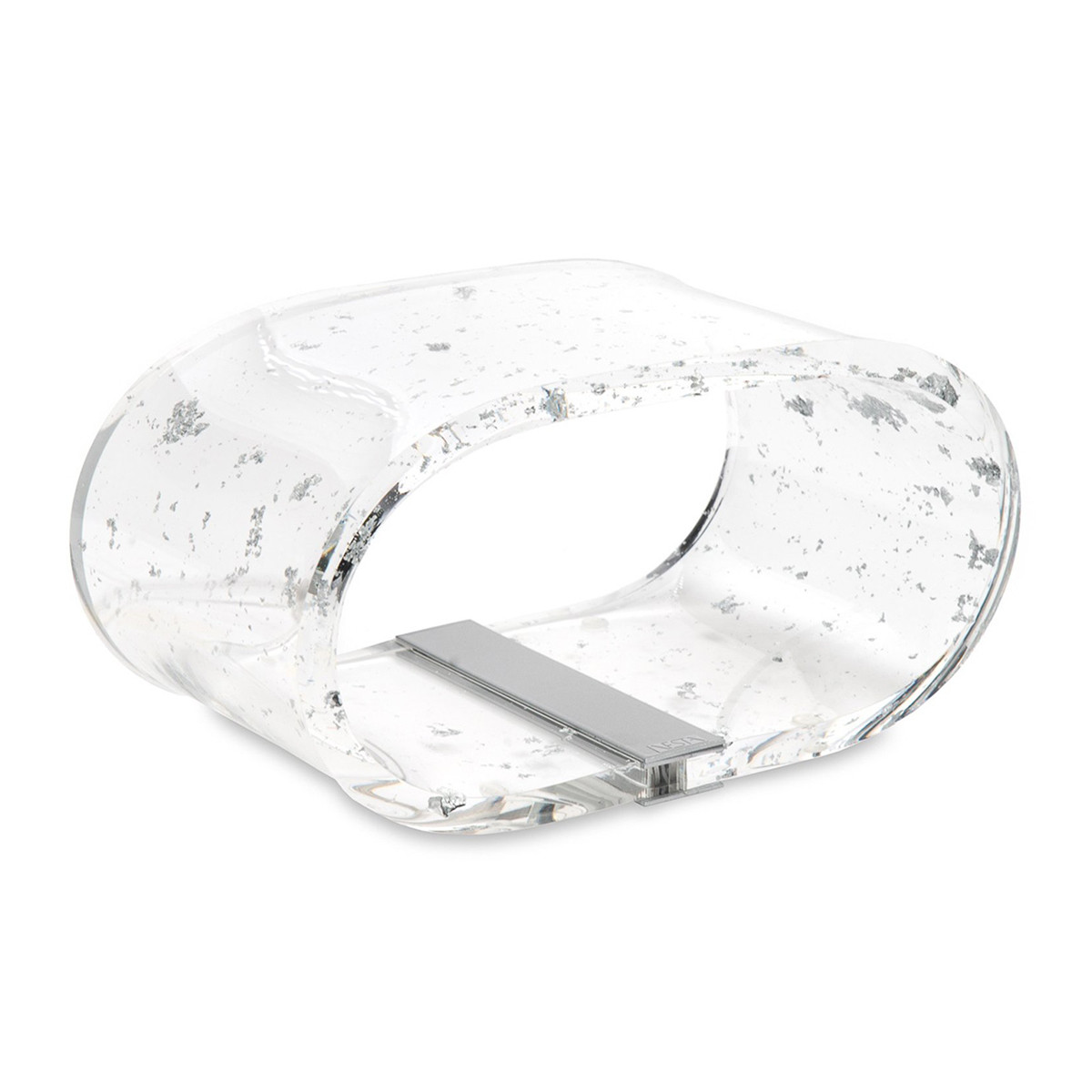 La Lampada Future Argento piccola Vesta Home è una lampada di design da tavolo in cristallo acrilico PMMA 10 mm con all'interno inserti di foglie argento ed illuminata a LED. Le caratteristiche fisico tecniche del materiale, straordinario conduttore di luminosità, permettono di diffondere una luce che ha il riverbero del materiale prezioso al suo interno.