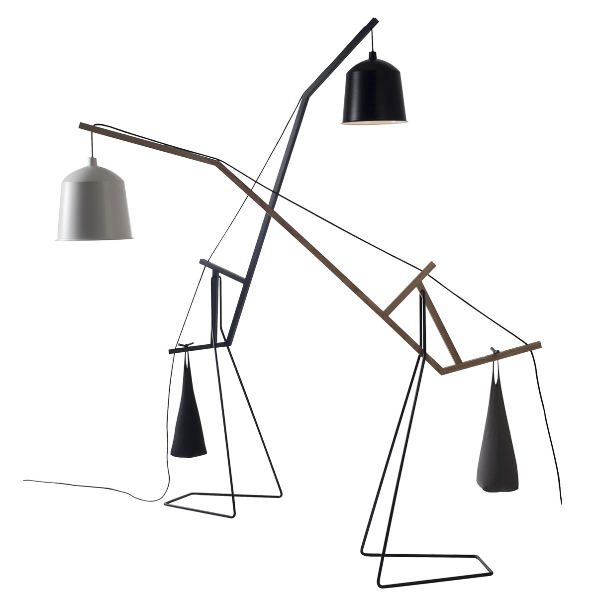 A Floor Lamp lampada da terra by Covo è una lampada da terra di design basata sul semplice meccanismo di una trave in equilibrio. Una lunga gru che attraversa la stanza in un gioco di equilibri dato dal paralume su un lato ed un sacchetto di sabbia dall'altro. Il sacco di sabbia può essere spostato manualmente in quattro posizioni per ottenere diverse configurazioni di illuminazione.