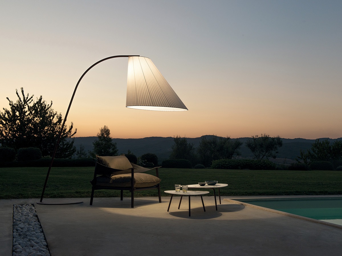La lampada da terra Cone 2004 si caratterizza fortemente per la forma ad arco della sua struttura in acciaio verniciato finitura corten. Porticati, verande, terrazze e giardini non passeranno di certo inosservati grazie anche in virtù del suo elegantissimo effetto luminoso. Forme della memoria indoor che migrano verso gli spazi esterni: la collezione di lampade Cone si ispira alle sagome eleganti e vintage delle abat-jour anni ’50, attualizzate grazie al sapiente utilizzo dei materiali e alla scelta delle forme generose. Completano la collezione Cone, la lampada piccola 2001, la lampada grande 2002 e la lampada a sospensione 2003, scegli la qualità, scegli il design made in Italy!