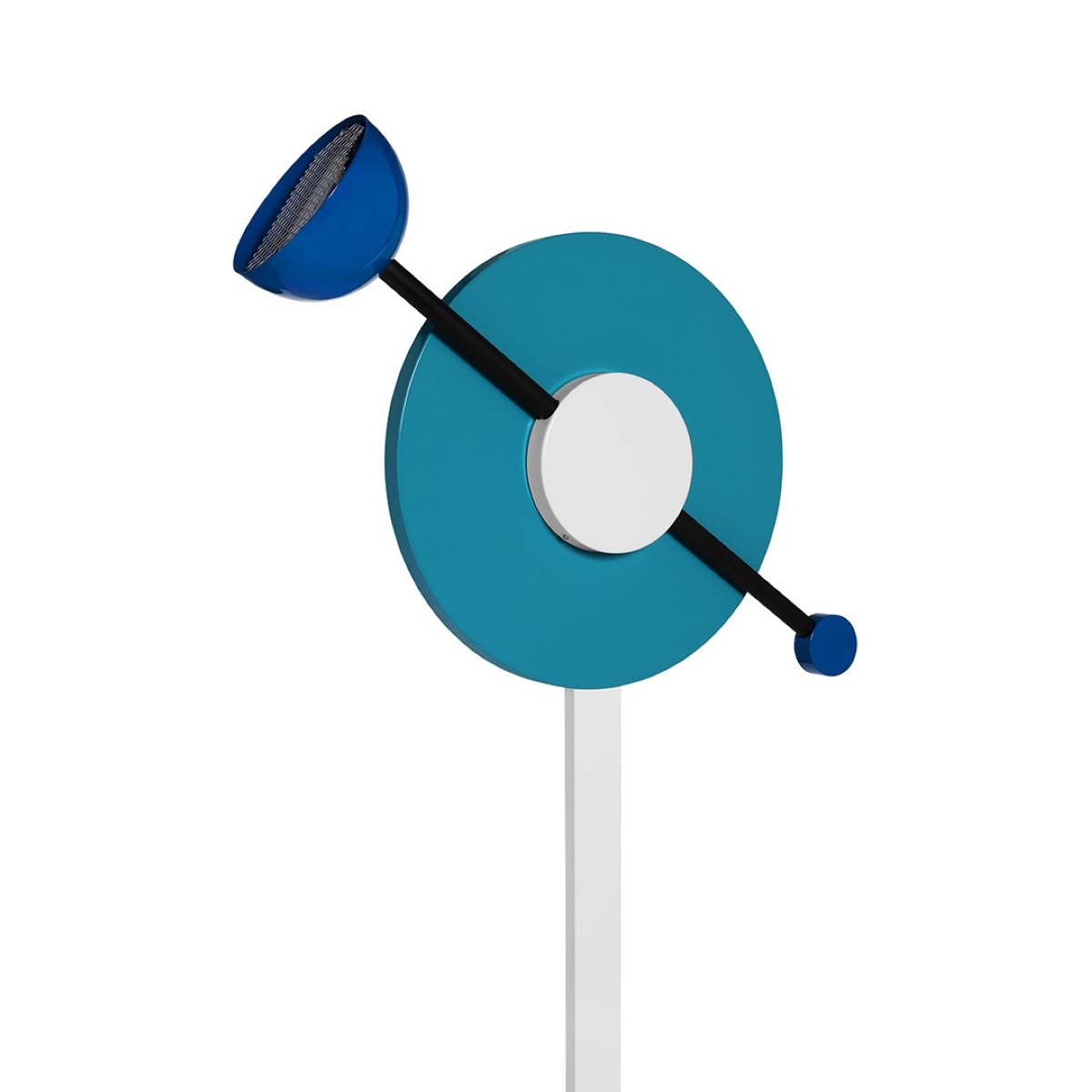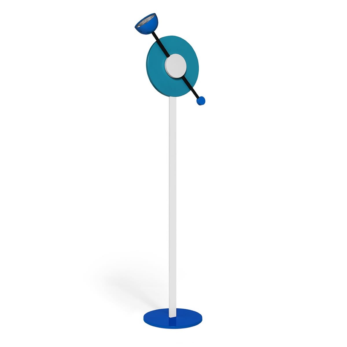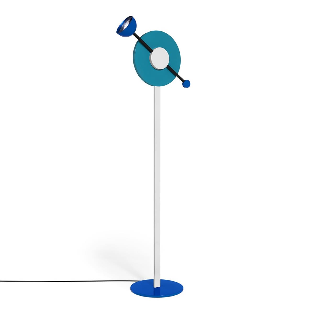 Memphis Milano Charleston Lampada da terra di Martine Bedin è una lampada di design in alluminio verniciato. Intensità luminosa dimmerabile. Charleston di Martine Bedin presenta delle notevoli qualità scultoree espresse dalla geometria creativa esaltata dall’azzurro vibrante e dal dinamismo – ricordato al nome che rimanda al ballo - ottenuto dalla combinazione di elementi circolari e figure rette. Il lungo tubo nero, che sostiene il diffusore, ruota a 360°: un sistema funzionale che consente tuttavia di orientare la luce in modo ludico, ruotando la "lancetta".