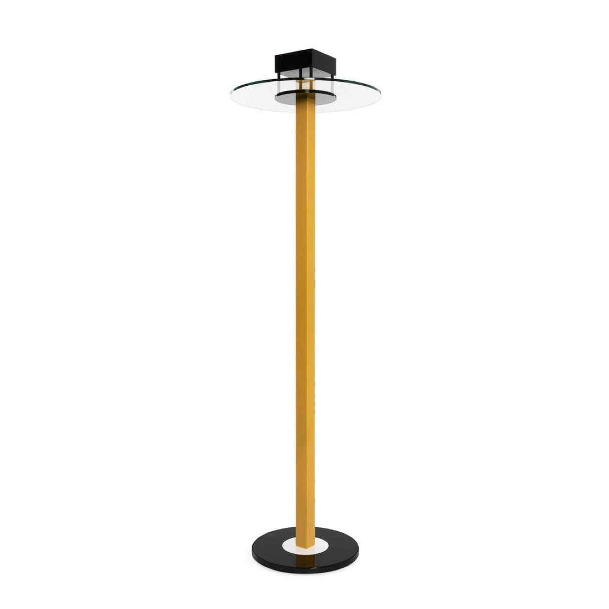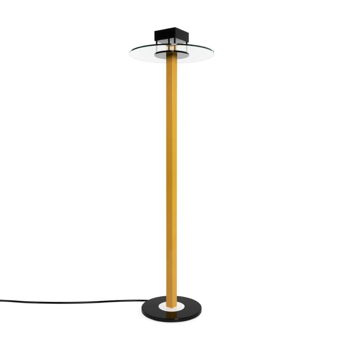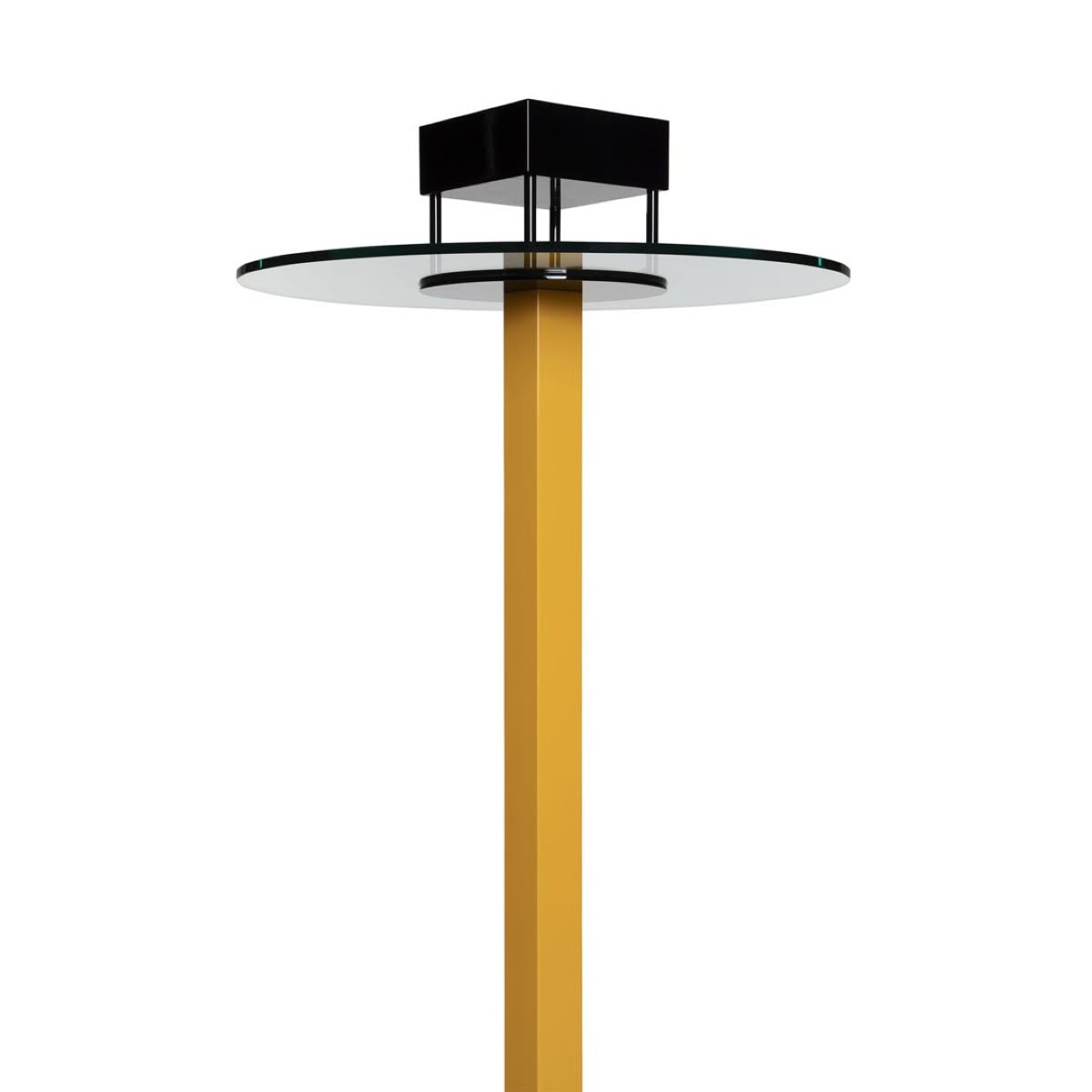 Memphis Milano King's Lampada da terra di Ettore Sottsass è una lampada di design in metallo verniciato, diffusore in vetro. Intensità luminosa dimmerabile. Il diffusore in vetro di King’s rimanda forme soprannaturali, mentre il corpo centrale giallo ci fa immaginare la scia di luce della navicella diretta verso il futuro. Il giallo caldo e brillante è utilizzato per generare nuovi impulsi nervosi al cervello, in grado di aprire ad insoliti stimoli e connessioni. Esso è una sorta di aerobica benefica per cellule pigre e sonnolente.