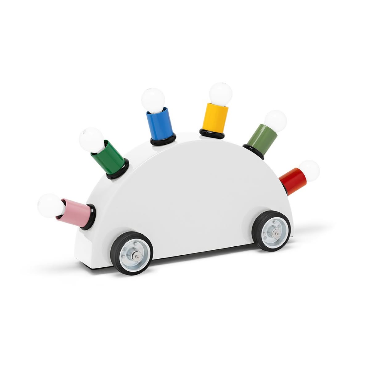 Memphis Milano Super Bianco Lampada da tavolo di Martine Bedin è una lampada di design in poliuretano strutturale e metallo. A dimostrazione dello spirito ludico di Memphis, Super di Martine Bedin può essere trascinata come un cagnolino al guinzaglio (con dorso arcuato come l'armatura di uno stegosauro). Super si compone di un semi-cerchio in fibra di vetro appoggiato su quattro ruote di gomma; il corpo è costituito da sei cilindri colorati in metallo laccato con portalampada. Le lampadine stesse contribuiscono all'estetica giocosa della lampada.