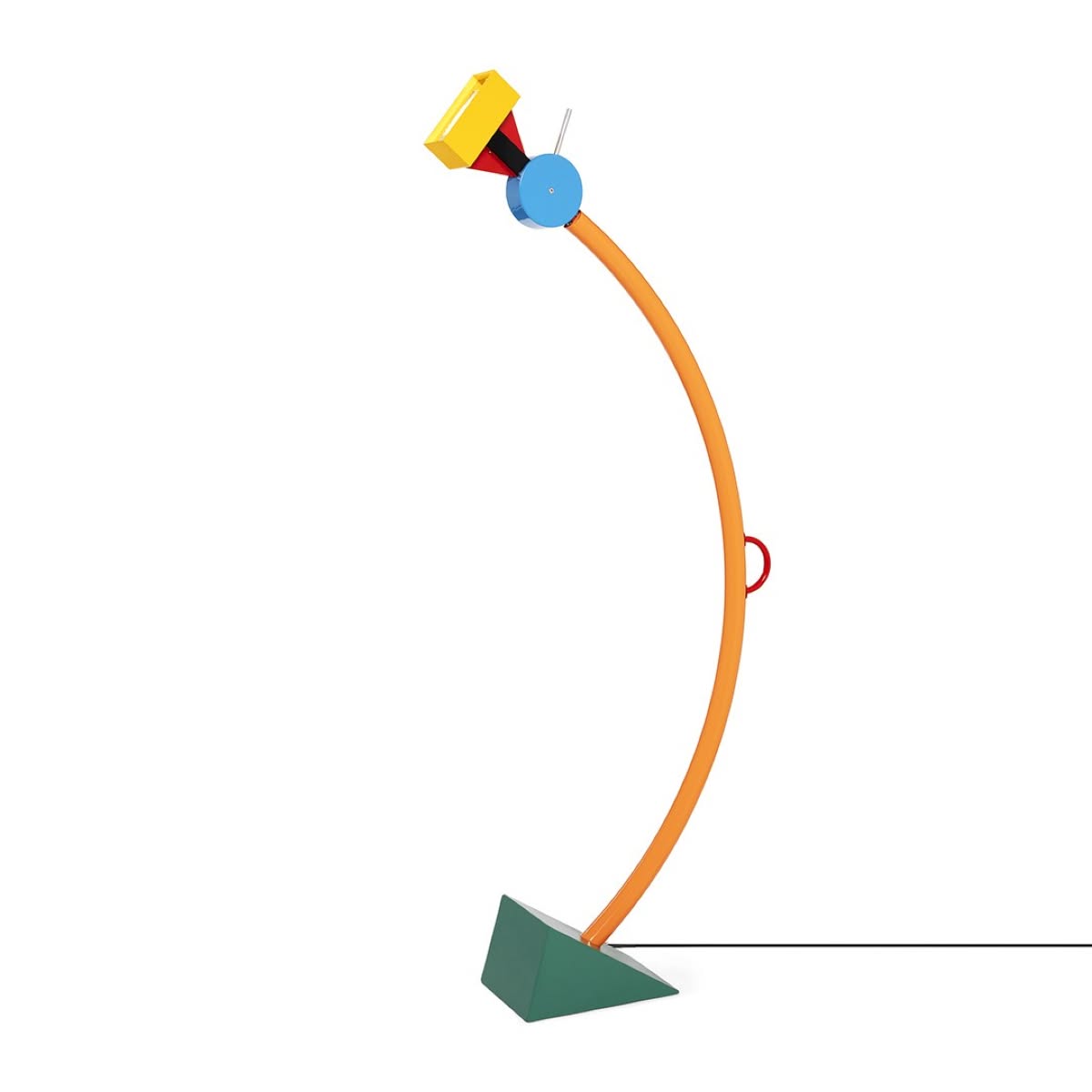 Memphis Milano Treetops Lampada da terra di Ettore Sottsass è una lampada di design in metallo verniciato, base in ghisa. Punto luce orientabile. Intensità luminosa dimmerabile. Treetops di Ettore Sottsass non è solo una lampada ma una vera e propria presenza dinamica, slanciata e colorata, in grado di infondere, con la sua allure vivace, gioia e spensieratezza a ogni ambiente. Il nome Treetops rimanda ironicamente all'immagine delle fresche e verdeggianti cime degli alberi. Il corpo centrale arancione diviene così il tronco, il prisma alla base rimanda alle radici e la sommità della lampada alle chiome degli alberi e agli uccellini che le abitano.