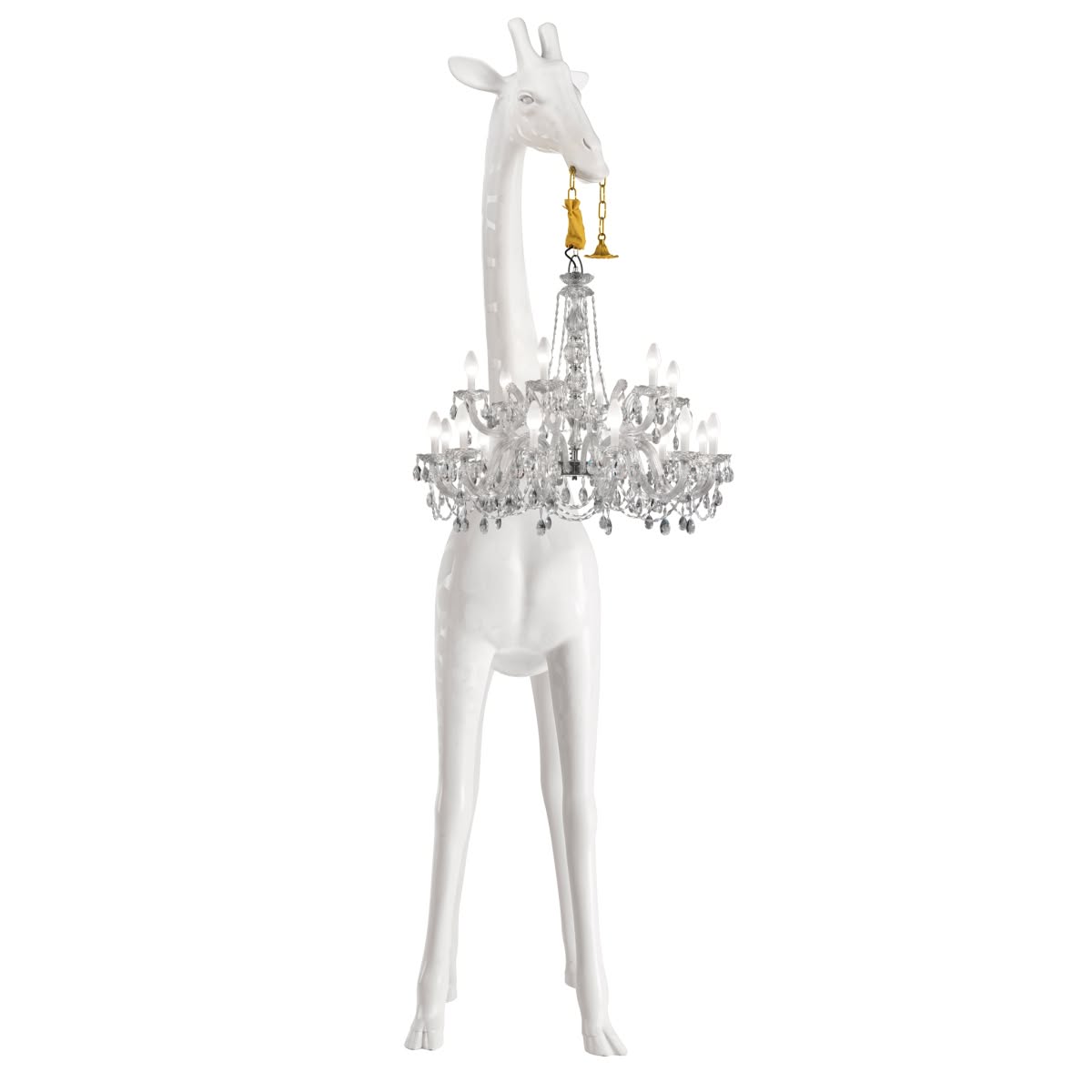 Giraffe in Love XL Outdoor by Qeeboo è lampada da esterno nata dalla collaborazione tra Marcantonio e Qeeboo nella sua massima espressione della grandezza naturale di una giraffa giovane alta 4 metri, formato perfetto per creare magiche ambientazioni outdoor, grazie anche allo chandelier resistente all’acqua e al vento. Una giraffa dall'aria trasognata che sostiene un lampadario classico in stile Maria Teresa. “Giraffe in Love” rappresenta l’ironia e la leggerezza; la giraffa è innamorata ma non lo sa ancora, perché avendo il cuore lontano dalla testa, vive l’amore senza pensieri.