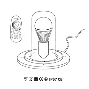 Impianto IP67, lampadina led RGB inclusa, 9W (E27) 100/240 V - 50/60 Hz- 850 lm - 2700/6500 K - 16 milioni di colori selezionabili- pilotabile con telecomando a RF da 2.4 GHz- Cavo nero 3m