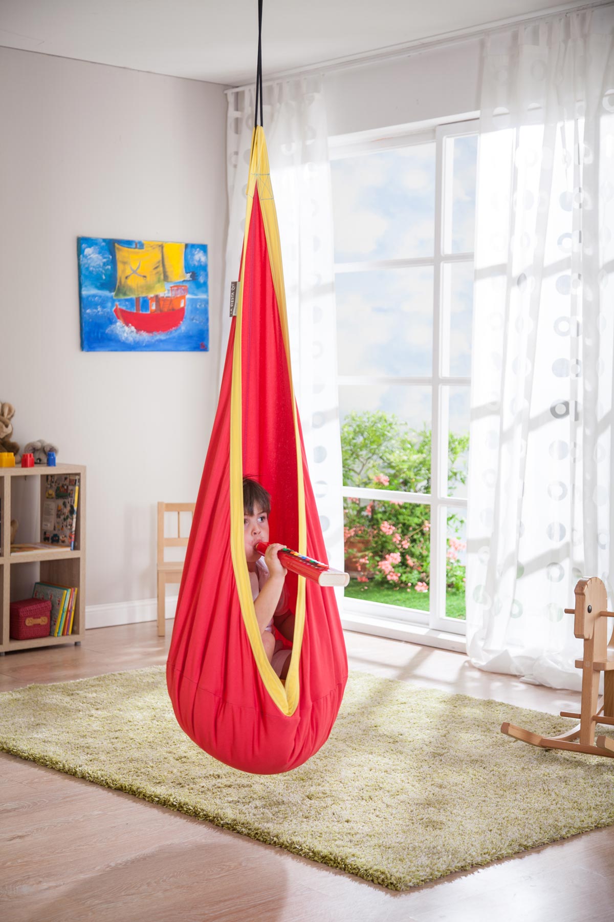 Joki Cherry è la tana pensile in puro cotone che pendendo dal soffitto come un bozzolo dal morbido cuscino alletterà i vostri piccoli a sognare, leggere e dondolare, come racchiusi in un dolce e confortevole nido intimo e privato. Il dolce dondolio favorisce lo sviluppo del senso dell'equilibrio, ciò influenza positivamente la capacità di concentrazione e il successo nel processo dell'apprendimento nel leggere e nello scrivere. Per questo motivo il nostro nido amaca Joki è consigliato dall'associazione federale tedesca per la postura e l'esercizio fisico (BAG). Joki è adatto per bambini dai 3 ai 9 anni. L'altezza minima di montaggio consigliata è di 2 m. La stoffa in puro cotone è robusta e di facile manutenzione. Il prodotto è certificato dall'associazione per il controllo tecnico tedesco (TÜV) ed è dotato del marchio GS per la sicurezza.