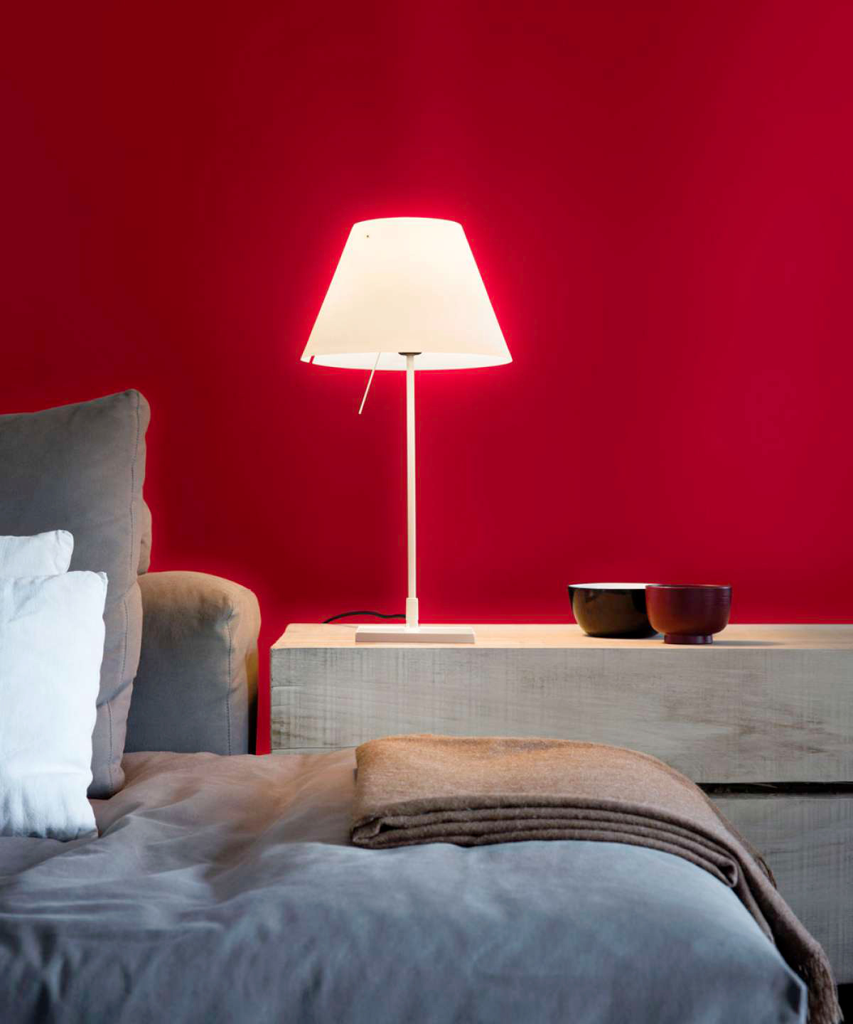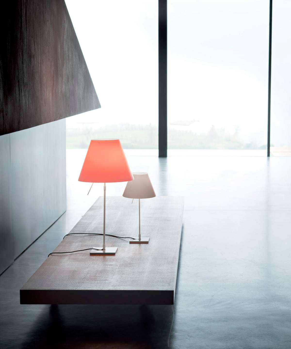 Luceplan Costanzina D13pi è la lampada da tavolo tanto discreta quanto solida. Costanzina si inserisce con semplicità in ogni ambiente senza porre vincoli stilistici di accostamento. Il paralume è proposto in 11 colori di policarbonato ed appoggia alla struttura di alluminio su due soli punti d’equilibrio. Se urtato, oscilla senza cadere. L'accensione e lo spegnimento della lampada da tavolo avviene attraverso un elegante interruttore posto direttamente sul paralume. Costanzina si inserisce magnificamente in qualunque ambiente, dalla camera da letto alla zona giorno o ufficio come piccola lampada da lettura. Anche in virtù della forma del paralume che permette la diffusione della sua luce sia verso il basso sia leggermente verso l'alto, può essere utilizzata con successo anche per l'illuminazione d'atmosfera.