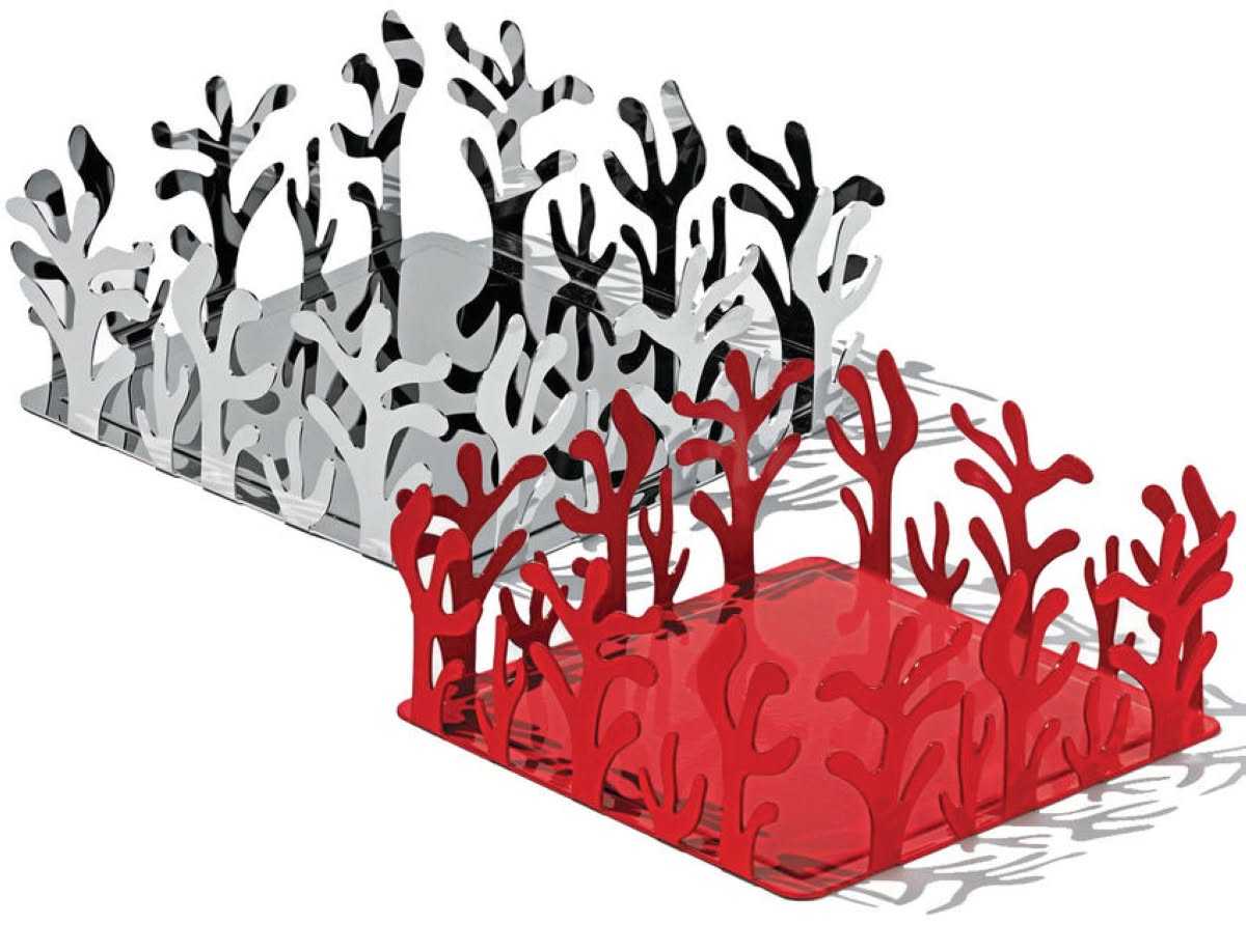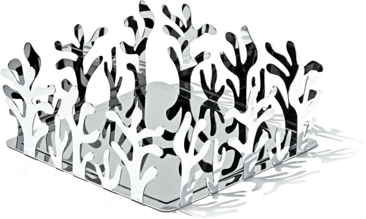 Alessi ESI18 Mediterraneo Portatovaglioli di carta stesi in acciaio Inox è il portatovaglioli di design in acciaio inossidabile 18/10 lucido. Emma Silvestris con il Portatovaglioli di carta propone un interessante ampliamento della linea “Mediterraneo”, con il suo fortunato e particolare disegno traforato. La declinazione di questo disegno iconico diventa questa volta un piccola serie di accessori da esterno. Il Portatovaglioli possiede un piccolo ma significativo risvolto funzionale: tra gli interstizi della traforatura è possibile introdurre la punta delle dita e sollevare il lembo del tovagliolo per estrarlo. La dimensione è adatta anche per i grandi tovaglioli del mercato americano. Il Portatovaglioli è ottenuto da un’unica lastra di acciaio inox traforata a laser e piegata. Realizzato in acciaio inox lucidato oppure con finitura a resina epossidica color corallo.