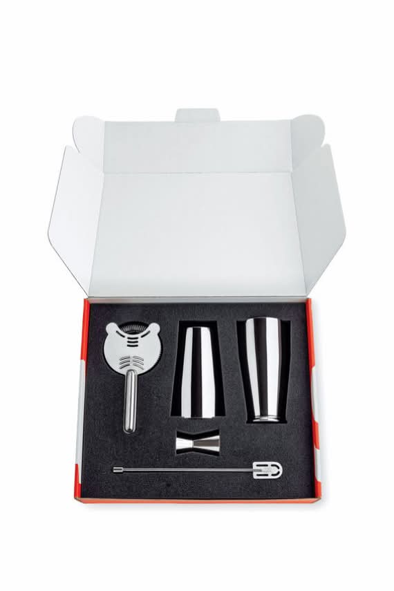 Alessi 5050SET I Lunar Eclipse Set è il set Bar di design di Ettore Sottsass composto da: agitatore americano o "Boston", passino da bar, frullino da bar e misurino per cocktail in acciaio inossidabile 18/10. Splendidamente prevedibile, perfettamente allineato, affascinante. Luce argentea svanisce nel cielo scuro, fondendosi senza sforzo l’una nell’altro. Questo è il tuo “Lunar Eclipse”. Derivati da un’approfondita ricerca di Alberto Gozzi sugli utensili professionali per il bar e per i vini, questi strumenti sono considerati un must nei bar di tutto il mondo. Prepara cocktail al chiaro di luna con Lunar Eclipse, il set per la miscelazione dei cocktail ispirato all'universo lunare: oggetti dalle raffinate finiture lucide che diffondono un brillante bagliore argenteo, proprio come la luna. Perfetto sia per i barman che per gli amanti dei cocktail, Lunar Eclipse fa parte dell'iconica collezione Mixology, che comprende utensili da bar diventati elementi essenziali nei migliori bar del mondo. Il kit per la miscelazione dei cocktail include uno shaker americano, un misurino per cocktail, uno strainer da bar e uno stirrer. Lo shaker 5050, oggetto per il servizio del bar divenuto ormai classico, è stato disegnato nel 1979 da Ettore Sottsass e dunque è in catalogo da più di 40 anni. Abbiamo deciso di modificare nella sua parte alta il cosiddetto “Bicchierone”, che non sarà più in vetro ma in acciaio inossidabile. Questa modifica ci è stata richiesta da più parti nell’ambiente professionale dei mixologist in quanto l’acciaio è certamente più affidabile del vetro nell’uso veloce e a volte scattante dei barmen.