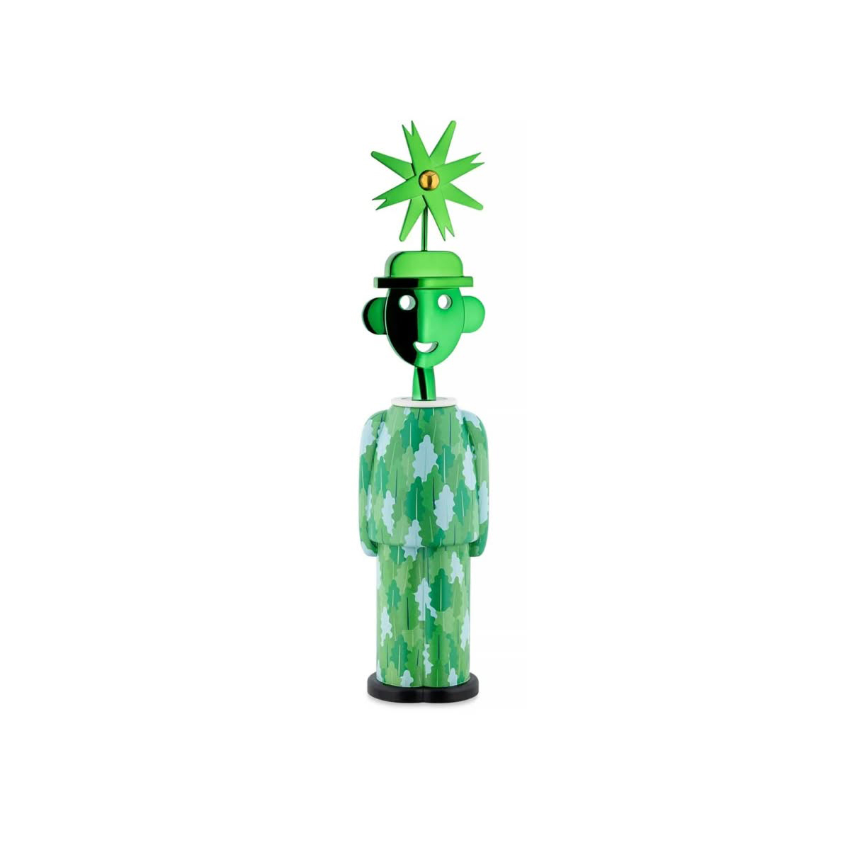 Alessi AM23A/FM Alessandro M. Arborea Cavatappi Limited Edition è l'accessorio di design in AlkiPaper® e zama cromata, decoro Fulvia Mendini. Accessori metallici con trattamento in PVD, verde, e ottone. Serie limitata a 9 pezzi numerati e 1 prova d'autore. Per celebrare l'iconica coppia di cavatappi disegnata dal padre Alessandro, Fulvia Mendini ha immaginato una fiaba ambientata in un bosco di querce, dove i due personaggi danzano alla ricerca infinita di desideri e segreti. In questa edizione limitata, realizzata in soli nove pezzi più una prova d'autore, Alessandro M. indossa un cappello a forma di girandola ed è impreziosito da un'esclusiva finitura PVD nei toni del verde. La zama è una lega a base di zinco e durante il processo di lavorazione non disperde nell’ambiente sostanze che possano causare inquinamento; la bassa temperatura di fusione della lega permette inoltre un notevole risparmio energetico, che contribuisce ad abbattere lo sfruttamento delle risorse naturali a monte. Le parti in acciaio e gli elementi in resina termoplastica sono facilmente disassemblabili, permettendo il riciclo dei materiali.