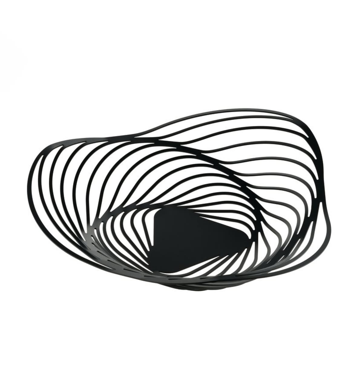 Alessi ACO01 B Trinity Centrotavola in acciaio colorato è il centrotavola di design per la tavola in acciaio colorato con resina epossidica, nero. Un oggetto industriale traduce la bellezza della natura. Una nuova collaborazione che arricchisce la collezione dei Centrotavola prodotti da Alessi: “Trinity” è il primo progetto disegnato per l’azienda da Adam Cornish. Il lavoro di questo giovane designer australiano tende a creare movimento, sia visivo sia fisico, impegnando i sensi delle persone e incoraggiandole a guardarlo più da vicino. “Trinity” è un Cestino disegnato partendo da una semplice forma geometrica che viene sviluppata, come fosse un vortice, fino a formare un’elegante struttura concentrica. La dinamicità dell’oggetto trae ispirazione dalla struttura del guscio del mollusco “Nautilus” . All’interno della conchiglia sono infatti presenti delle camere che, aumentando di numero con l’aumentare dell’età del mollusco, danno vita a una sinuosa struttura a spirale. Il desiderio dell’autore è quindi quello di riproporre l’aspetto di un elemento naturale attraverso i moderni processi di produzione industriale. La forma del Cestino è ottenuta attraverso un processo di traforatura a laser della lamiera d’acciaio, successivamente sagomata con un’operazione meccanica. La struttura traforata e le dimensioni capienti rendono “Trinity” adatto a essere utilizzato non solo come Centrotavola ma anche come elegante Fruttiera. “Trinity” è realizzato in acciaio inossidabile e disponibile in due versioni: acciaio a finitura lucida oppure verniciato di colore bianco.