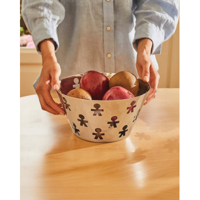 Alessi AKK04 Girotondo Cestino traforato in acciaio Inox è il cestino di design per la tavola in acciaio inossidabile 18/10. Il cestino traforato Girotondo è un icona del catalogo Alessi. Il duo creativo King-Kong, Stefano Giovannoni e Guido Venturini, ha ideato il motivo degli omini che si rincorrono in un girotondo, da cui il nome della collezione: un traforo dal linguaggio immediato ed evocativo, che trova spazio su oggetti di uso quotidiano. Gli omini dei King-Kong, icona che richiama il filone del design ludico basato sull’uso di “codici affettivi”, tanto da esserne uno degli esempi più citati, hanno fatto la loro fortunata comparsa su oggetti appartenenti alla più remota tradizione Alessi, come i vassoi e i cestini, per poi moltiplicarsi invadendo e conquistando altri dell’oggettistica, non solo per la cucina e la tavola.