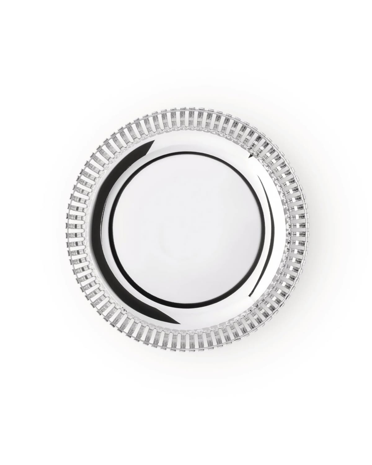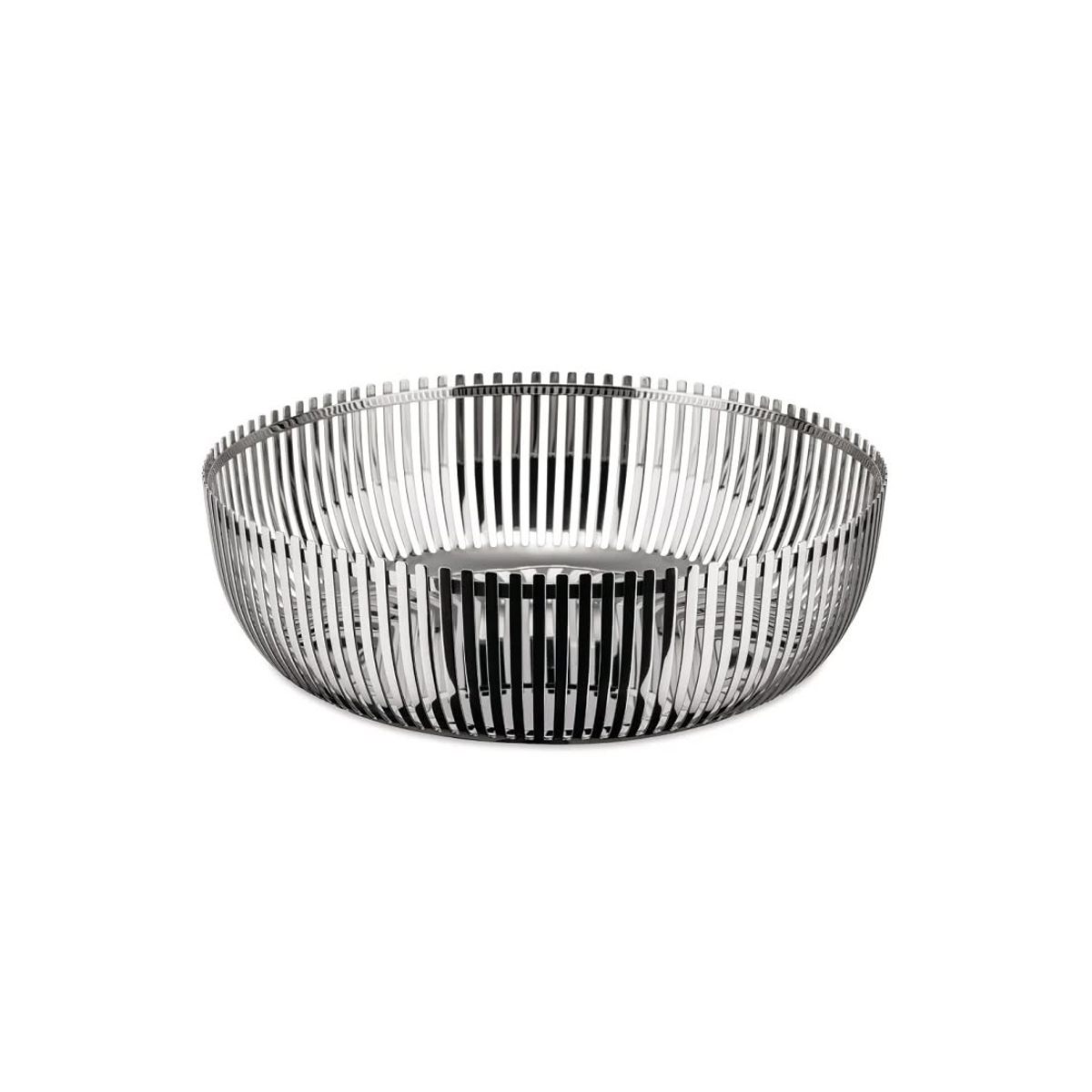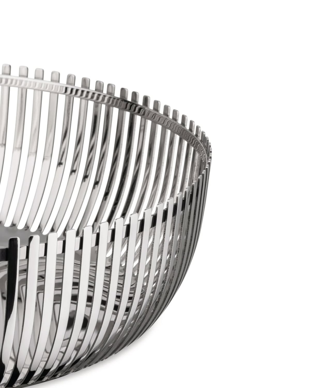 Alessi PCH02/23 Cestino in acciaio Inox è il cestino di design in acciaio inossidabile 18/10. Il cestino, disegnato da Pierre Charpin, per la sua indubbia funzione, è un oggetto essenziale del nostro paesaggio domestico della cucina e del soggiorno; una presenza che rimanda ad una memoria antica, preindustriale. 104 stecche di lucido acciaio formano un contenitore circolare dai riflessi inattesi. Il Cestino “PCH02” è stato concepito come un recinto di elementi verticali collegati alla sommità da una cerchiatura orizzontale. Il dettaglio di questo collegamento è stato risolto esattamente come in una staccionata di recinzione di un giardino: gli elementi verticali sono sormontati da quello orizzontale che li collega. La parte terminale dei 104 elementi verticali sporge di qualche millimetro rispetto al collegamento orizzontale, quanto basta per restituire una sensazione di ricca costruzione dell’oggetto. Ogni elemento verticale è unito con una saldatura invisibile a quello orizzontale che ne valorizza la pulizia e il rigore. Il Cestino, realizzato in acciaio inossidabile lucidato in due misure è utilizzabile come portapane nel diametro di cm 20 con un’altezza del bordo di cm 5 e come portafrutta nel diametro di cm 23 con un bordo alto cm 7.