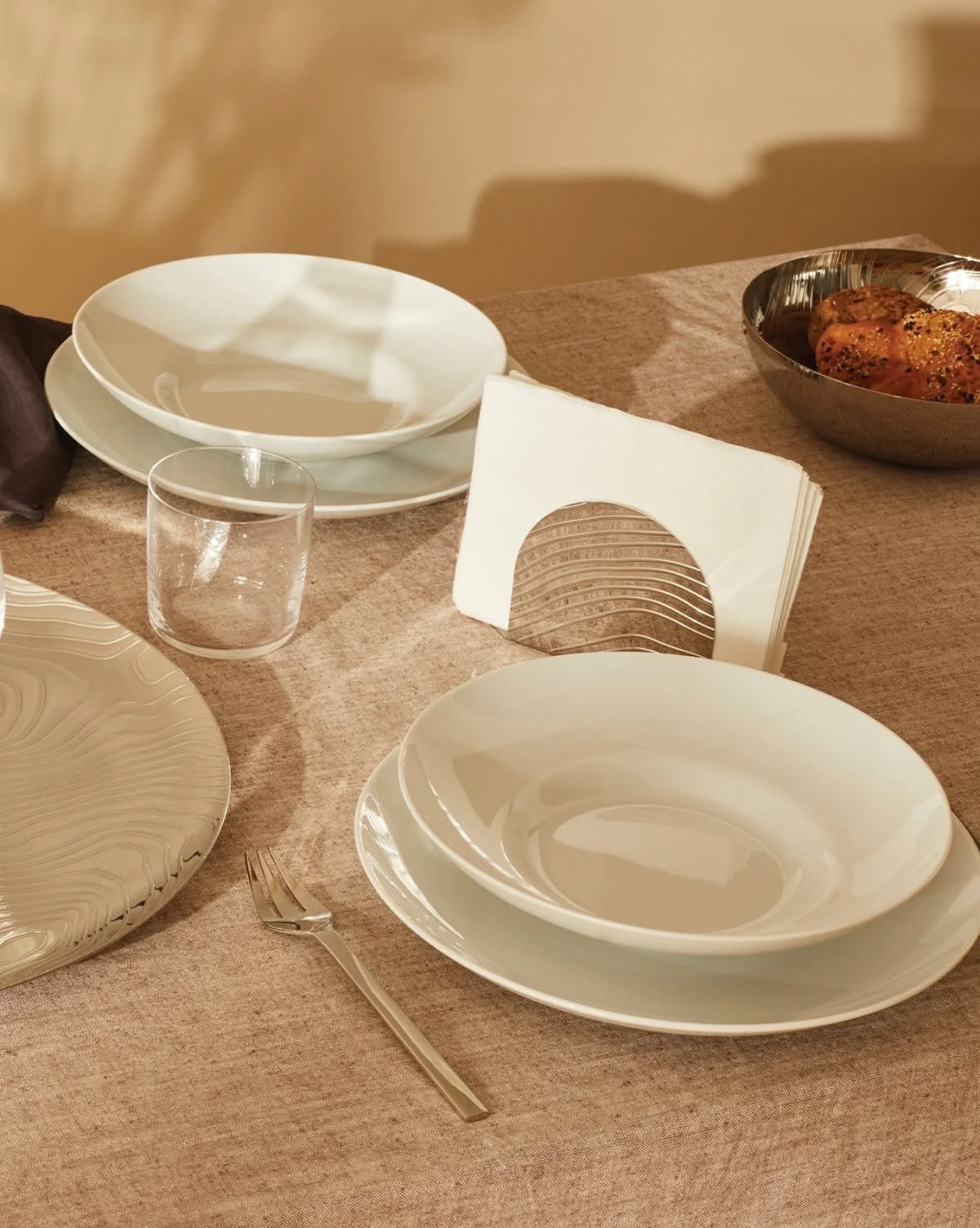 "Veneer è un velo che si posa delicatamente sulle superfici dei nuovi prodotti disegnati da Patricia Urquiola per Alessi. Il ritmo del decoro si muove sui volumi creando un piacevole effetto ondulatorio. Il movimento della texture reinterpreta in maniera controllata le venature del legno creando quasi un’illusione ottica, grazie alle linee fluide che navigano sulla superficie. Veneer diventa una grafica sognante e distintiva." Patricia Urquiola