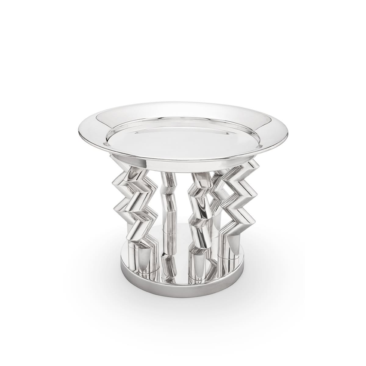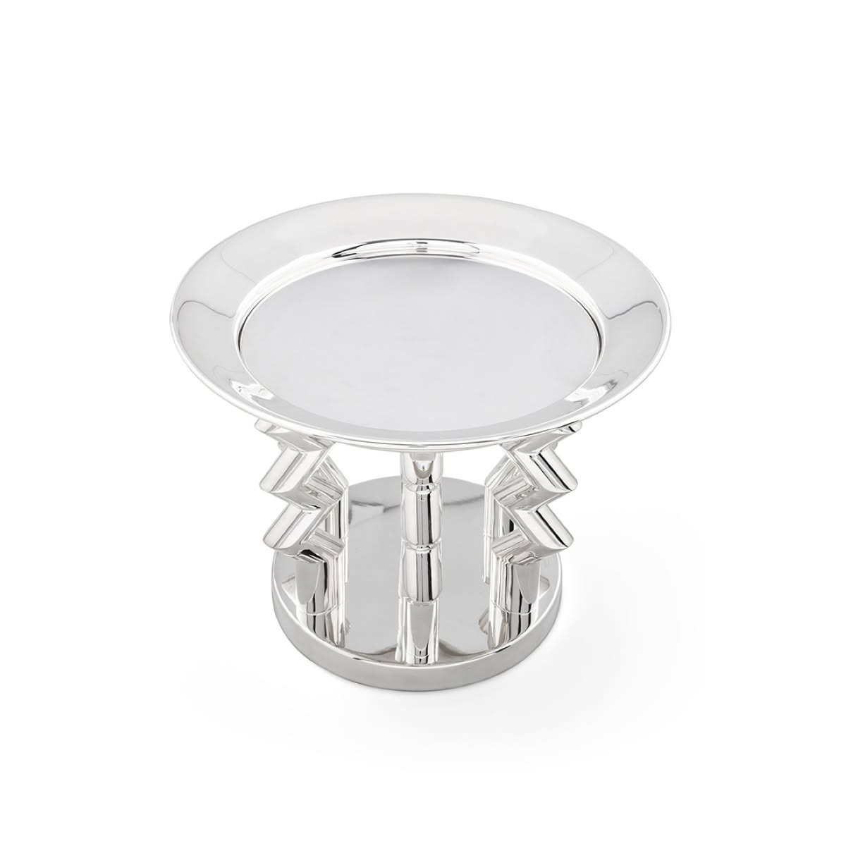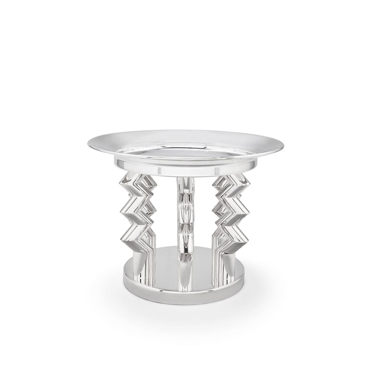 Memphis Milano Murmansk Portafrutta di Ettore Sottsass è un portafrutta di design in ottone argentato. Disponibile anche in argento 925 con quotazione su richiesta. Murmansk di Ettore Sottsass è una sorprendente fruttiera-centrotavola in ottone argentato, disponibile anche in argento 925. Il suo nome si ispira all'omonima città nell'estrema regione nord-orientale della Russia e la sua struttura si erge verso l’alto con imponenza ed eleganza con tre sostegni cilindrici dalle linee spezzate che reggono un appoggio circolare.