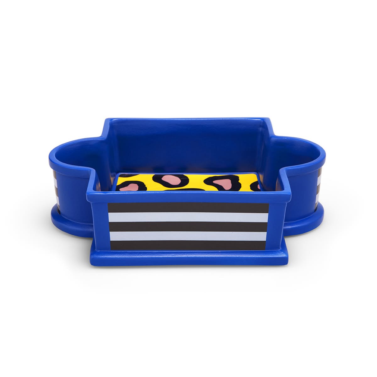 Memphis Milano Onion Portafrutta di Nathalie Du Pasquier è un portafrutta di design in ceramica dipinta a mano con decalcomanie decorative sublimate a forno.Onion di Nathalie Du Pasquier è un portafrutta - nonostante il nome sia ironicamente quello di un ortaggio - realizzato in ceramica e caratterizzato da un vivace motivo decorativo di macchie rosa con contorni neri su sfondo giallo.