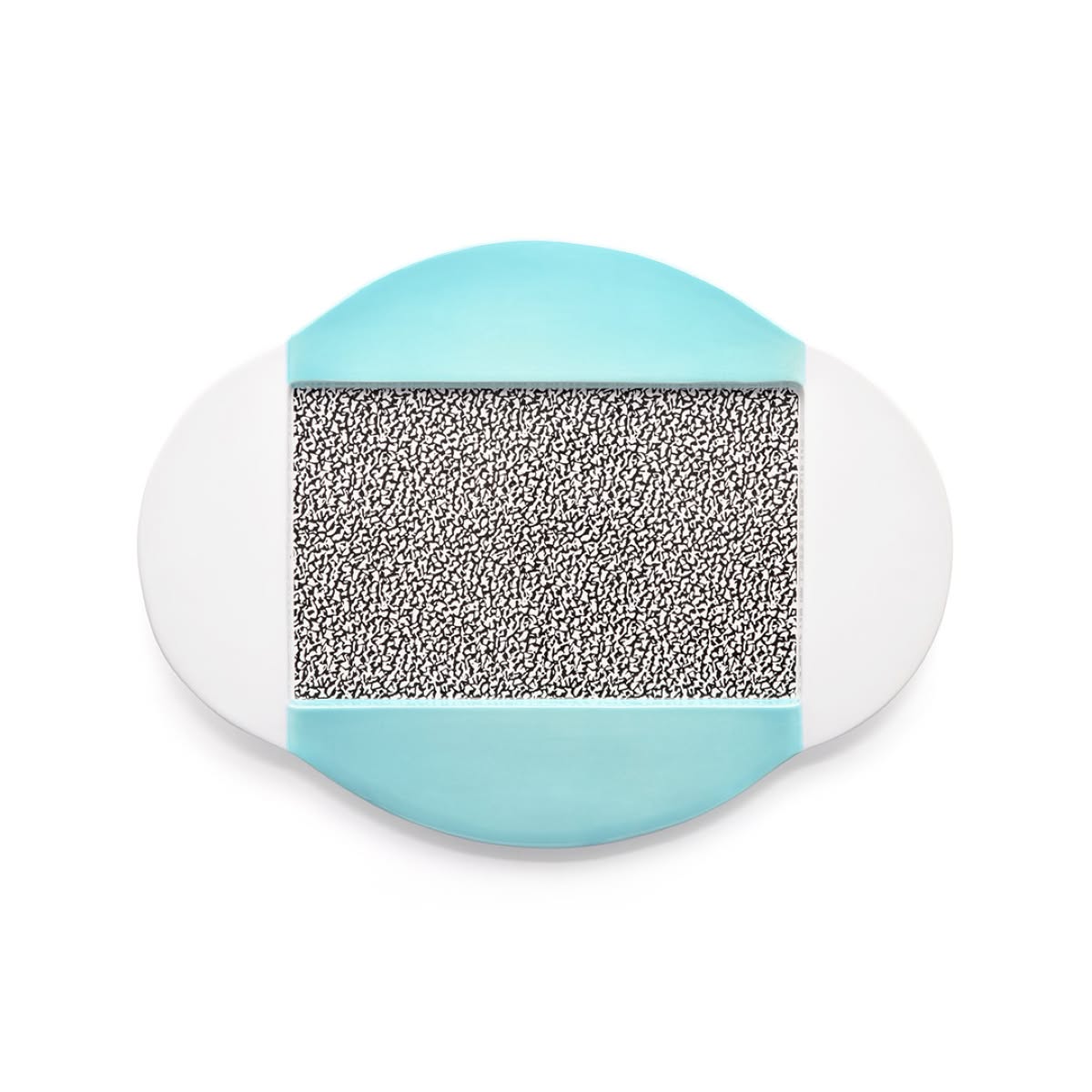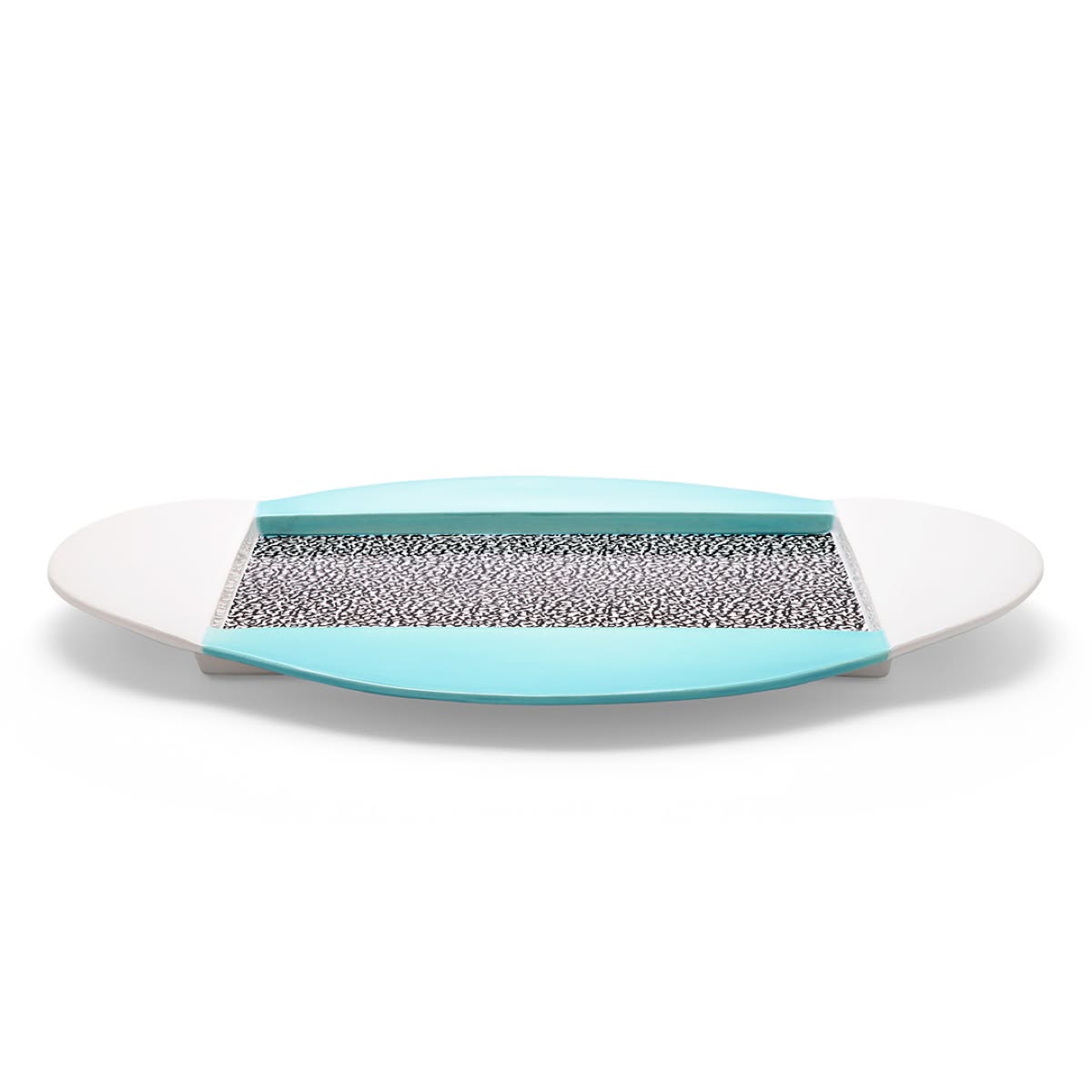 Memphis Milano Celery Piatto da portata di Michele De Lucchi è un piatto di design in ceramica dipinto a mano con decalcomanie sublimate a forno. Michele De Lucchi decora con dei pattern e figure geometriche Celery, un piatto da portata in ceramica. Lavora per giustapposizione di figure semplici: nella parte centrale un rettangolo in decalcomania decorativa con motivo spugnato in bianco e nero definisce il centro della composizione, mentre la forma del piatto è delimitata da una superficie circolare bloccata orizzontalmente da semicerchi colorati.