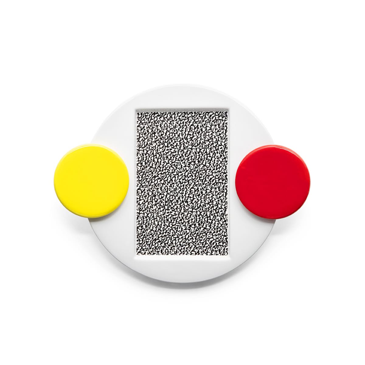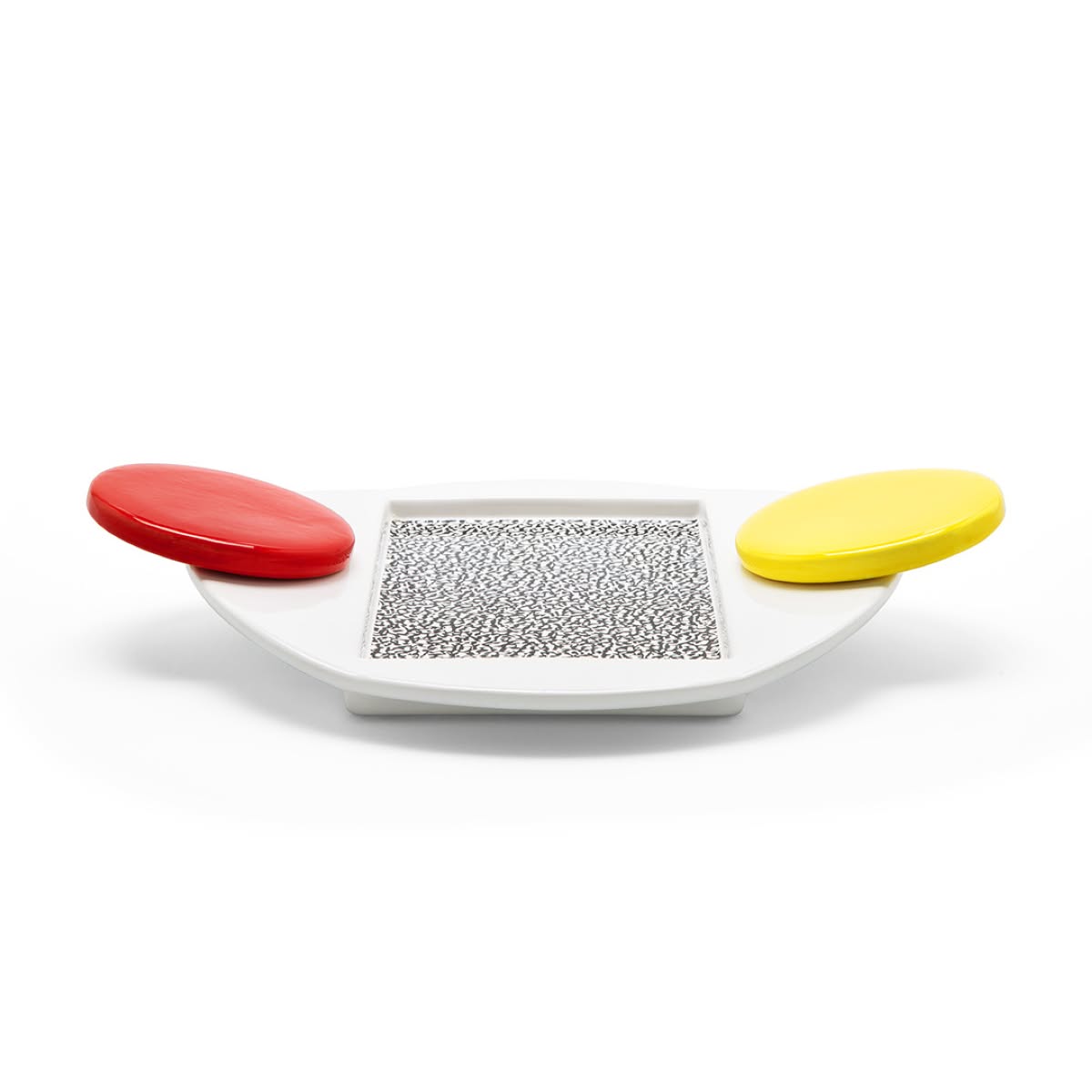 Memphis Milano Tomato Piatto da portata di Michele De Lucchi è un piatto di design in ceramica dipinto a mano con decalcomanie sublimate a forno. Michele De Lucchi decora con dei pattern e figure geometriche Tomato, un piatto da portata in ceramica. Lavora per giustapposizione di figure semplici: nella parte centrale un rettangolo in decalcomania decorativa con motivo spugnato in bianco e nero definisce il centro della composizione, mentre la forma del piatto e delimitata da una superficie circolare bloccata orizzontalmente da cerchi.
