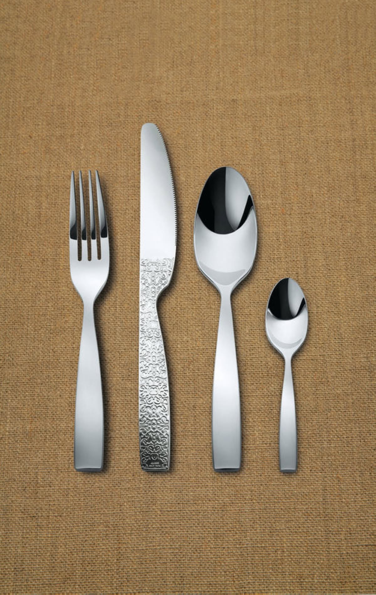Alessi MW03S24 Dressed Servizio di posate in acciaio inox è il servizio di posate di design composto da sei cucchiai da tavola, sei forchette da tavola, sei coltelli da tavola, sei cucchiaini da caffè in acciaio inossidabile 18/10 con decoro a rilievo.