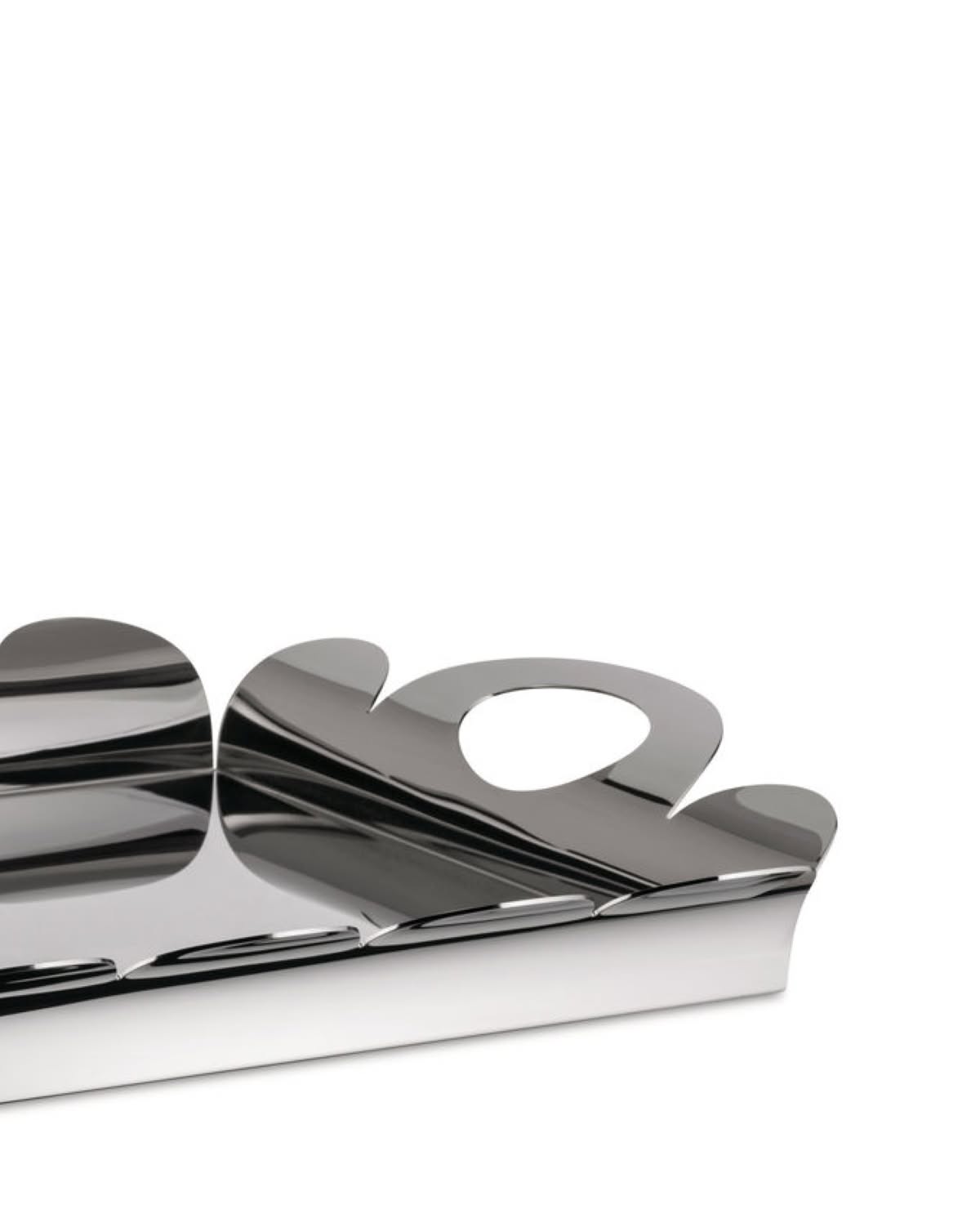 Alessi AM14 Recinto Vassoio rettangolare in acciaio Inox è il vassoio di design per la tavola in acciaio inossidabile 18/10, lucido, con bordo rialzato decorato con smerlatura e manici con taglio eseguito al laser. Il bordo smerlato caratterizza un progetto mendiniano dell’epoca di Alchimia, nei primi anni ’80, e allora prodotto artigianalmente in poche decine di esemplari; dal 1997 è entrato nella produzione Alessi, declinato in vassoi e cestini, con una felice sintesi di forma e funzione: i manici intagliati infatti assicurano una presa salda e sicura.