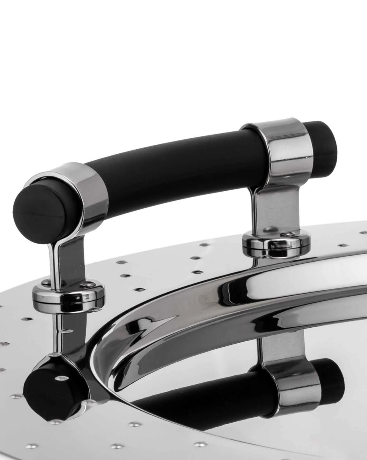 Alessi MGVASS Vassoio rotondo in acciaio Inox è il vassoio di design in acciaio inossidabile 18/10 lucido e PA con decorazioni bugnate e manici in PA di colore nero. Lo stile riprende i particolari decorativi della famiglia del celebre bollitore con l’uccellino del 1985.